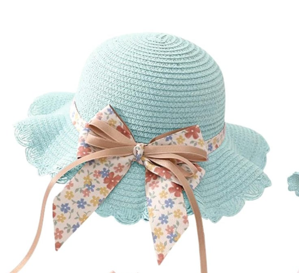 light blue sun hat, with a wide brim and a decorative bow. The bow is a light brown color with a floral pattern. The hat is designed to provide shade and protection from the sun. It's a stylish accessory that could be worn during outdoor activities or at the beach.
