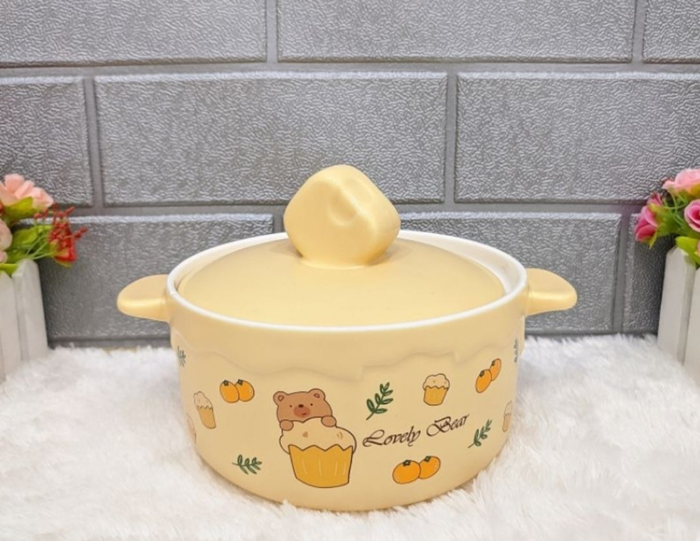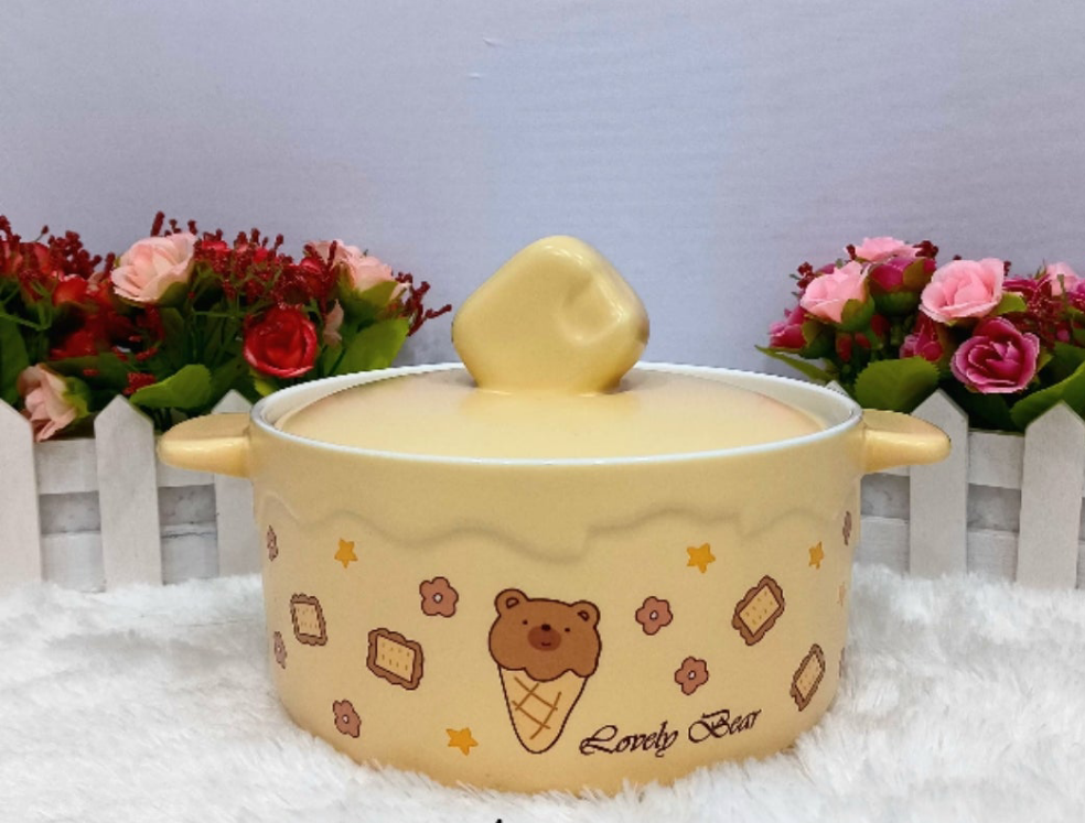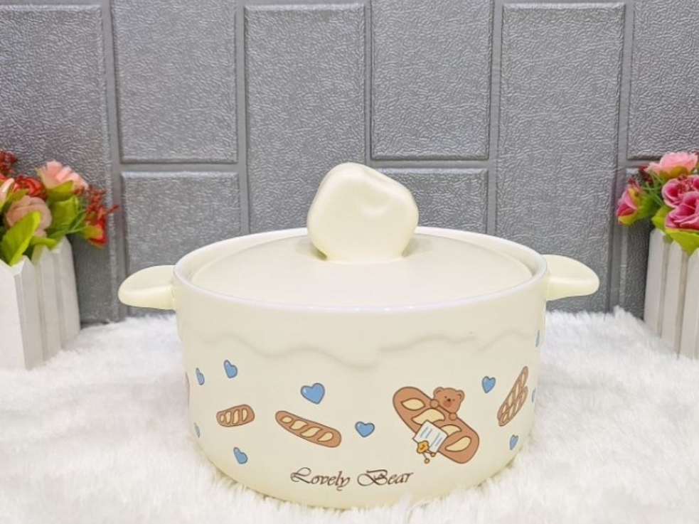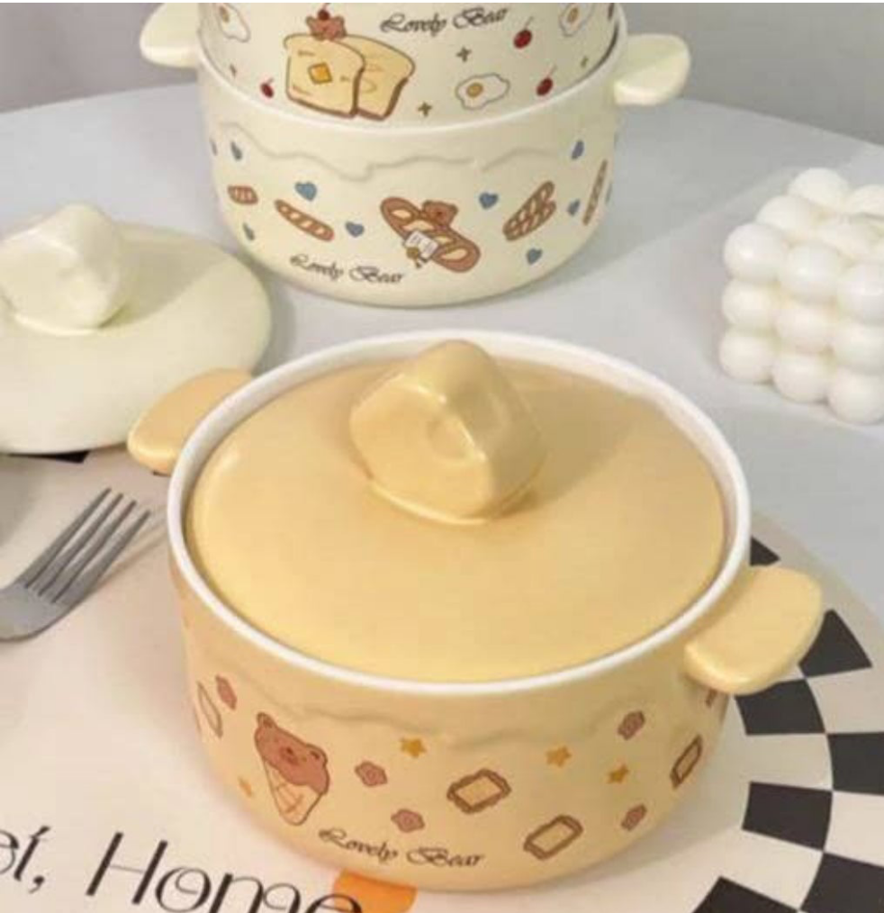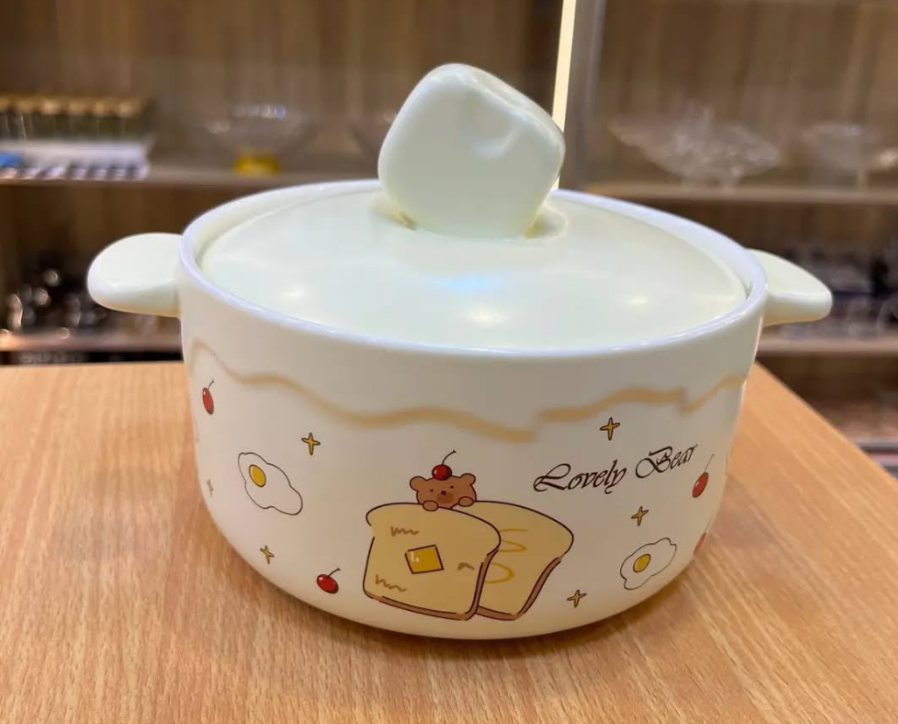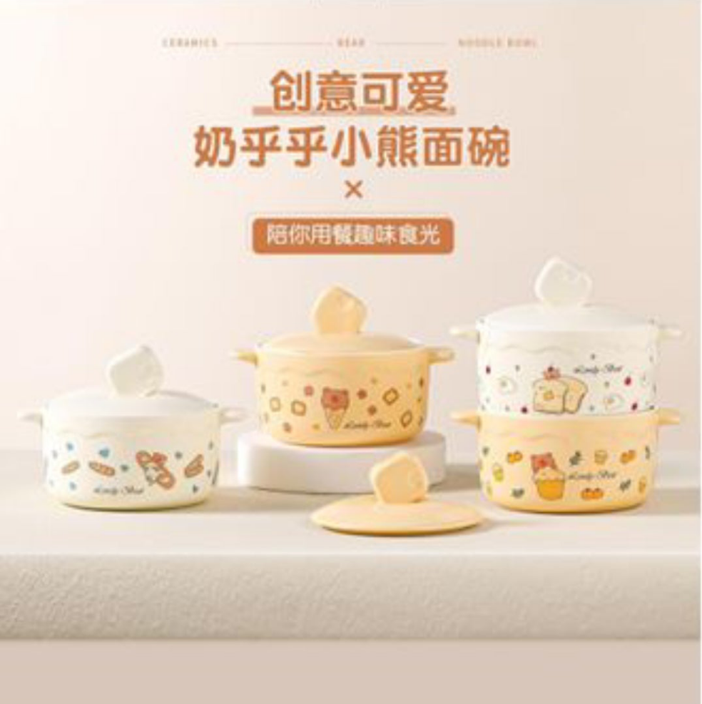 These are ceramic double-ear bowls with lids, designed for various meals like noodles, soup, or rice.