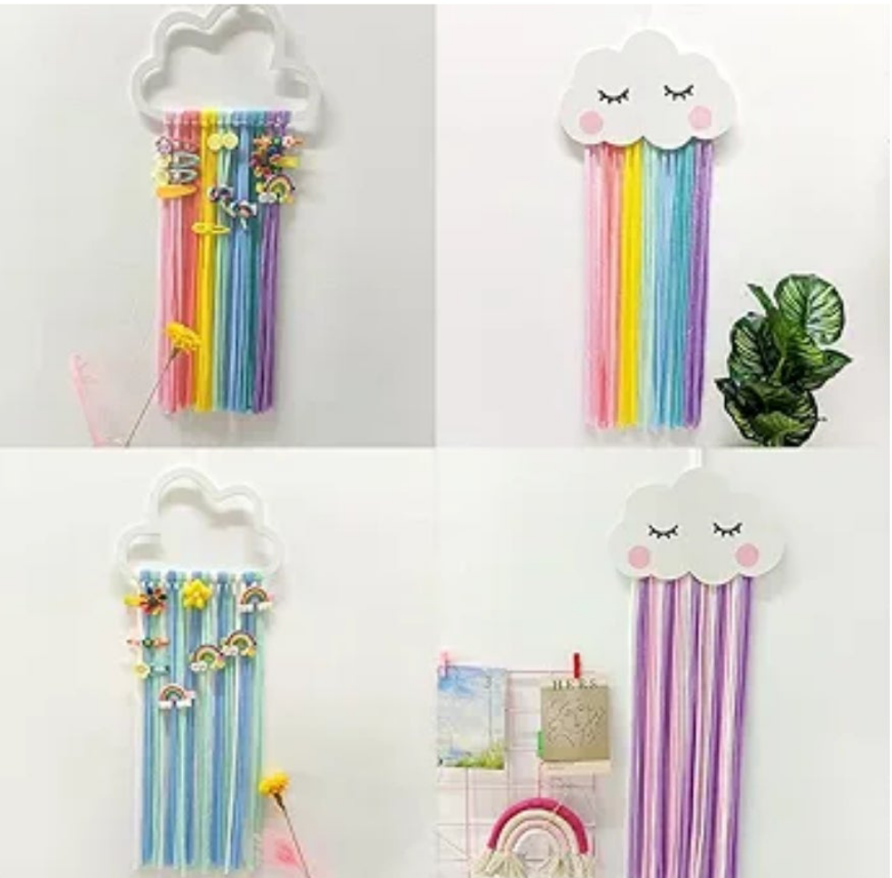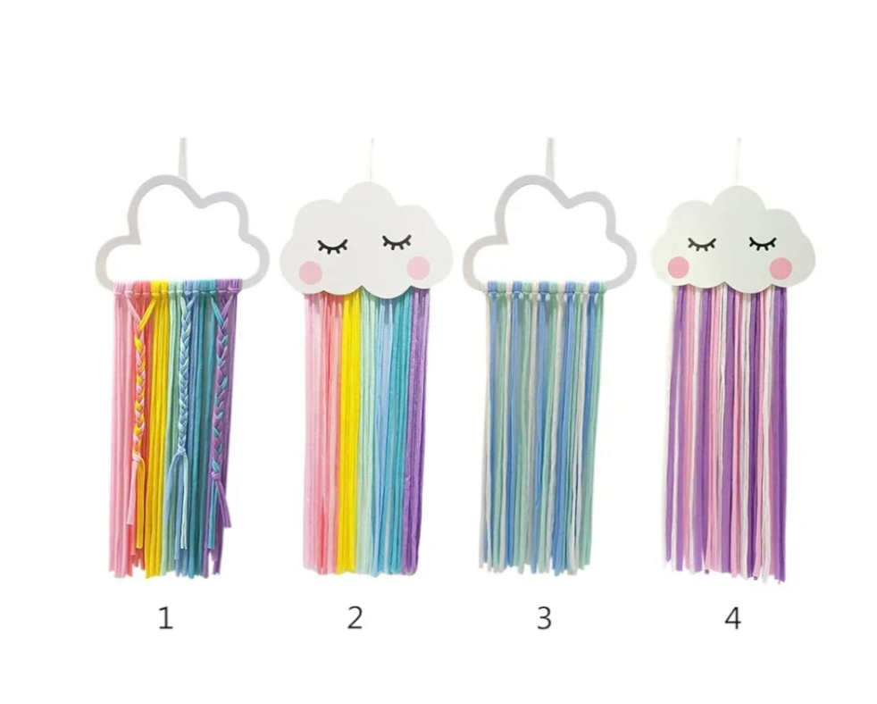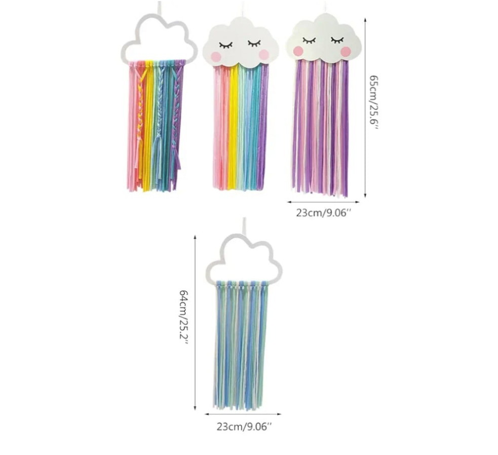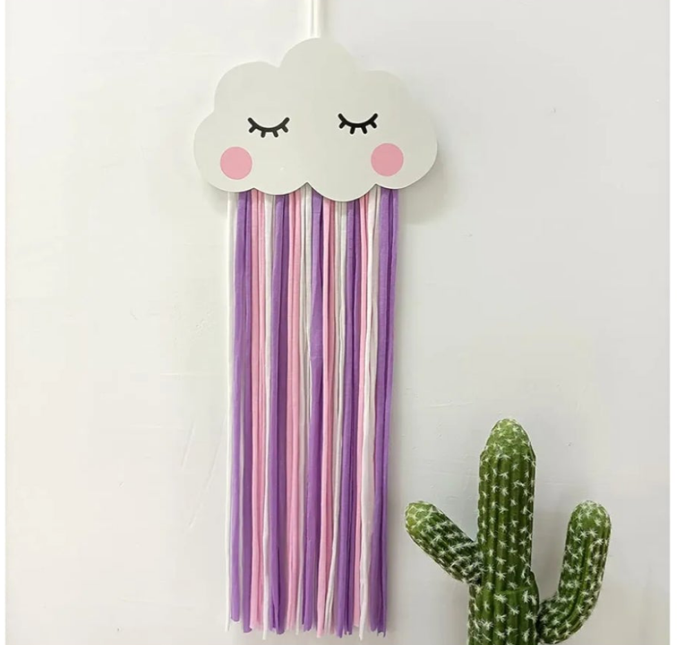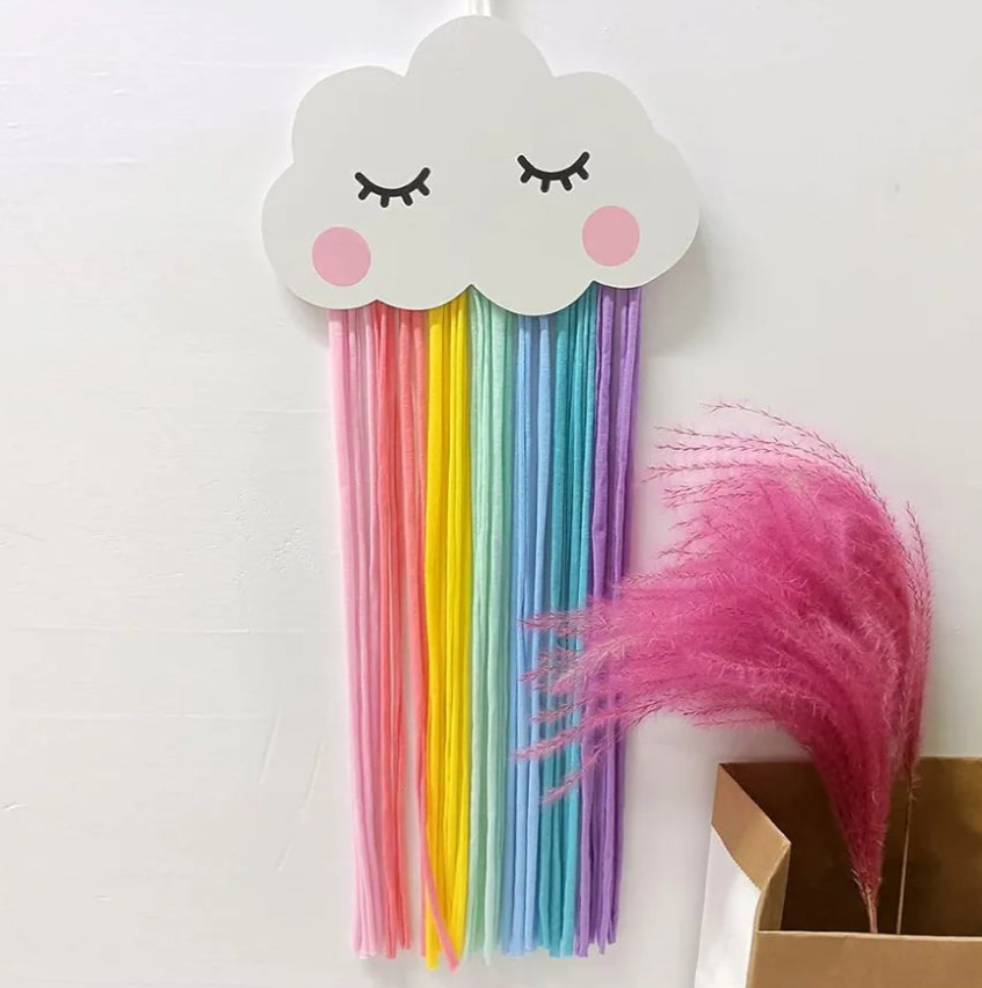 It features a cloud-shaped top and colorful rainbow tassels, often handcrafted.