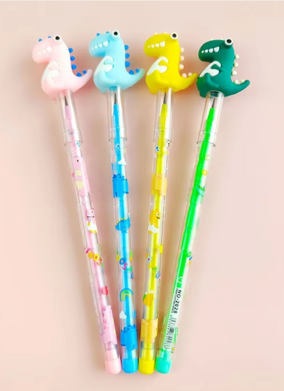 They are usually non-sharpening stackable pencils with replaceable refills or gel pens with dinosaur-themed toppers.