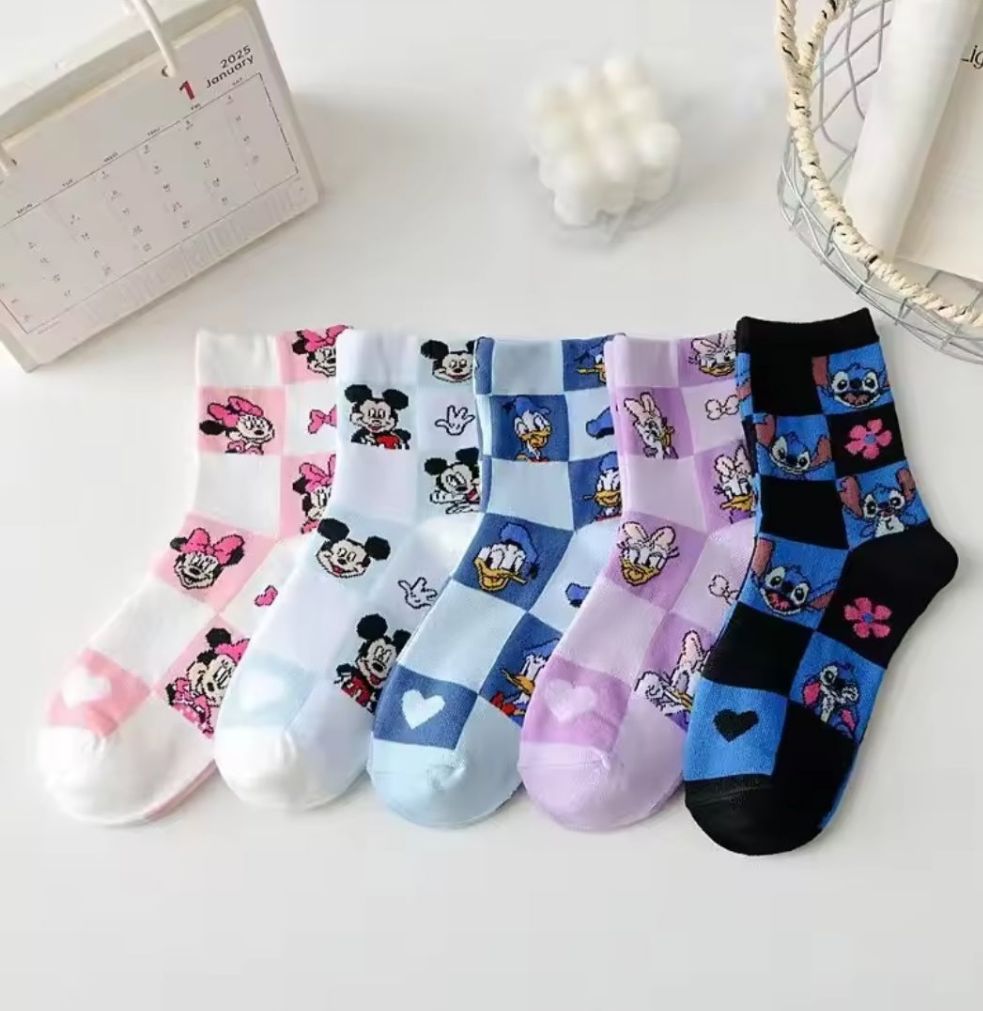 Characters:The set includes multiple pairs of socks, each featuring different popular Disney characters such as Mickey Mouse, Minnie Mouse, Donald Duck, Daisy Duck, and Stitch.
