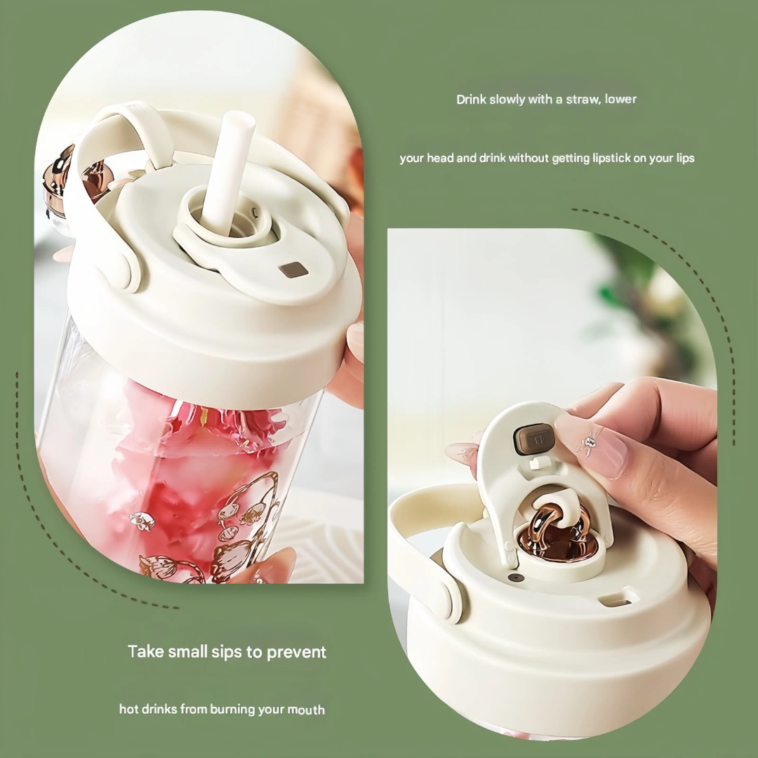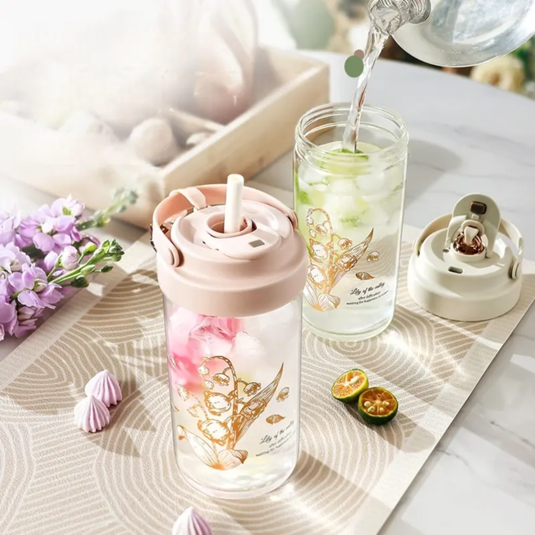 🌸 Elegant Floral Glass Bottle with Straw Lid – Lily of the Valley Design