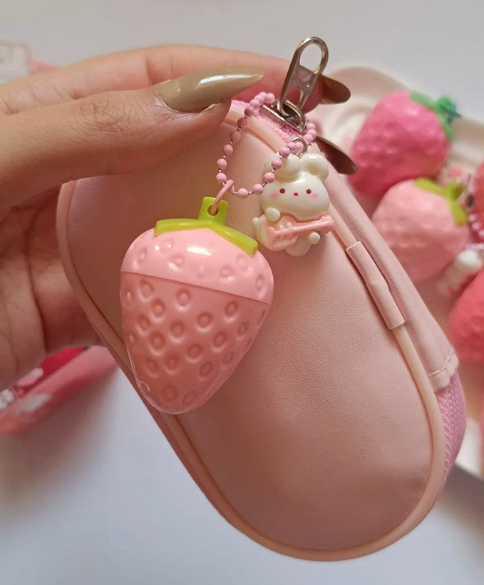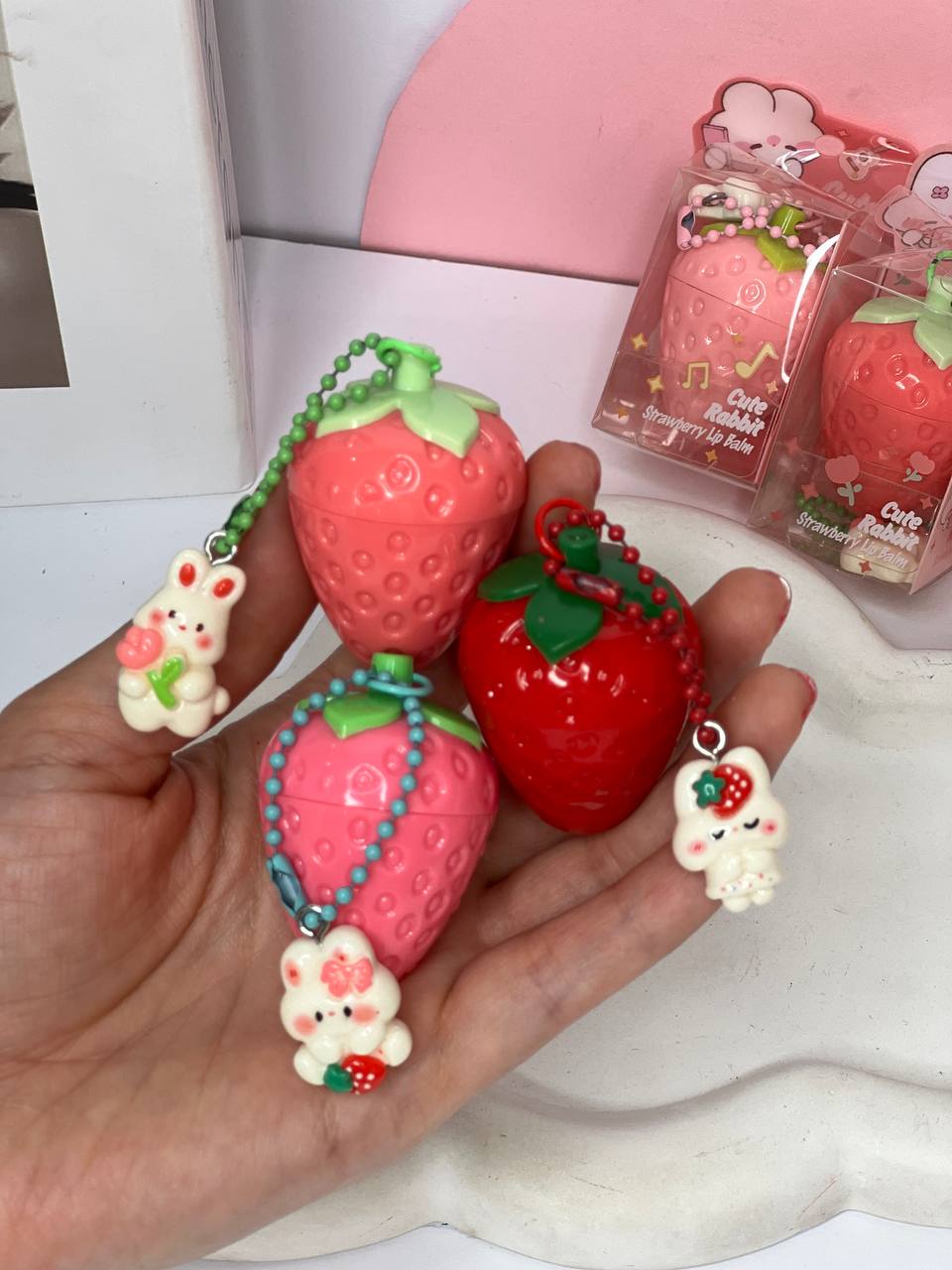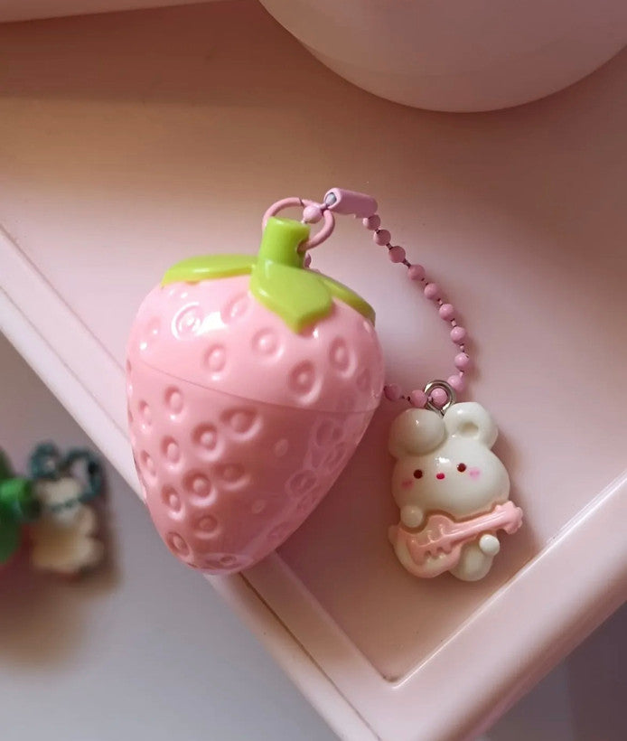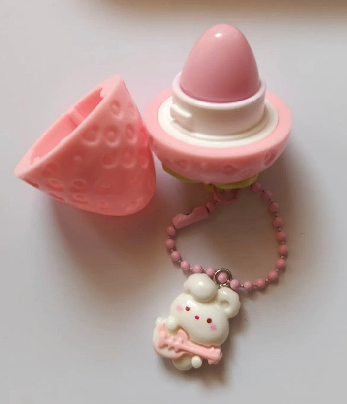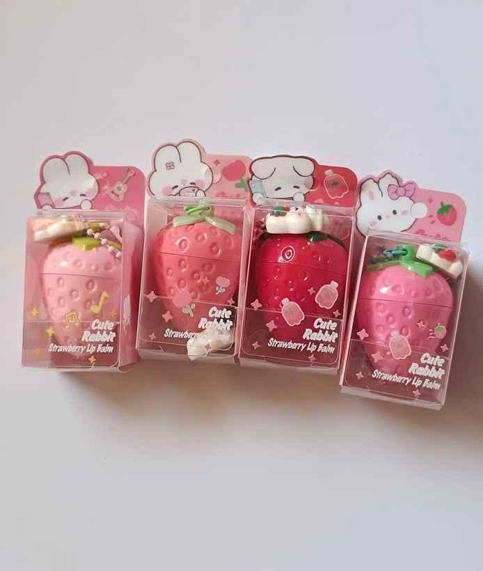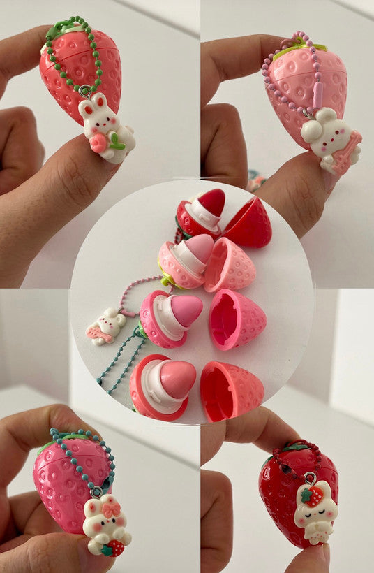 Cute & Kawaii Design: The lip balm is housed in a whimsical, textured strawberry-shaped container, featuring an attached charm of a cute little bunny. It's a fun and eye-catching accessory for all ages.