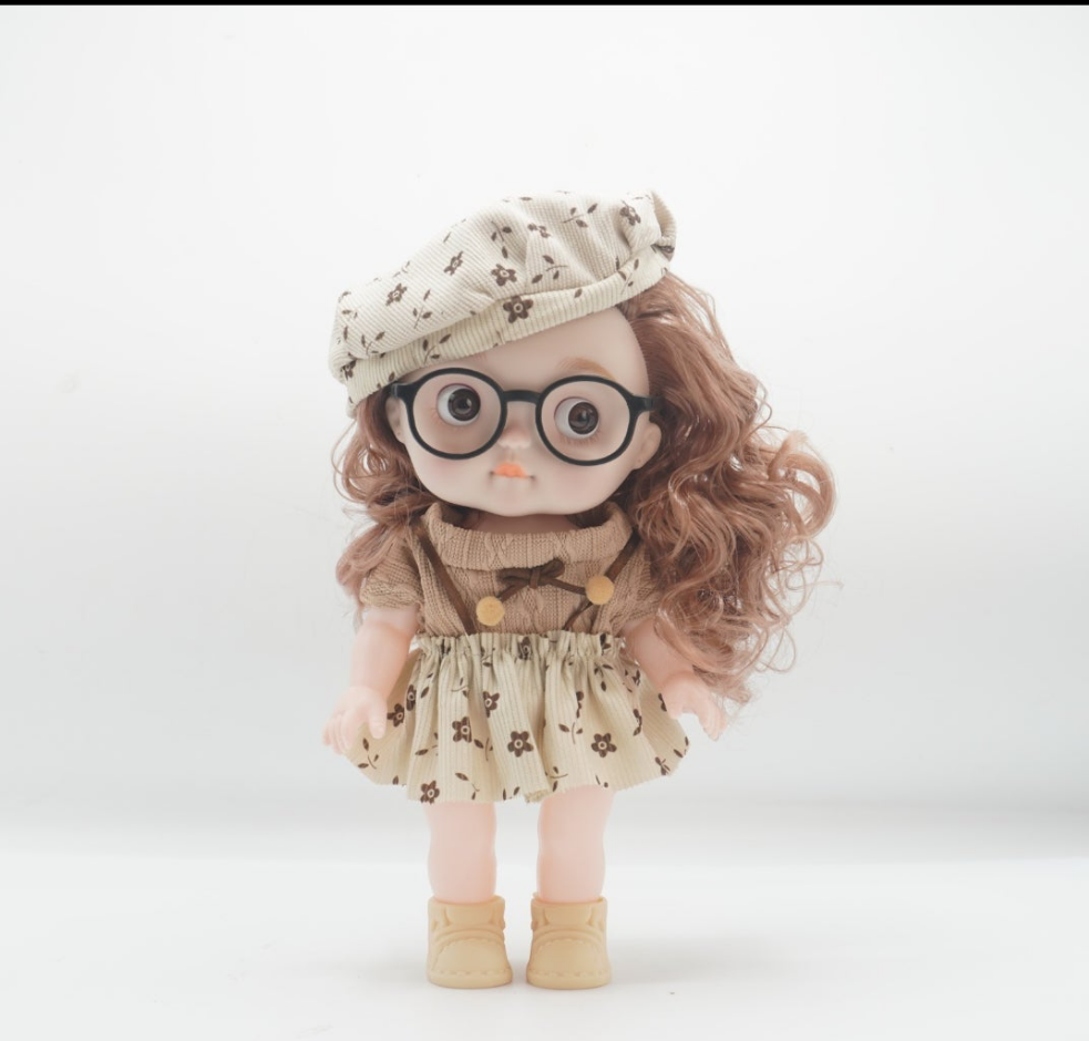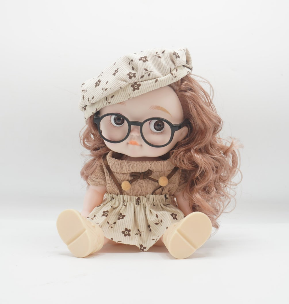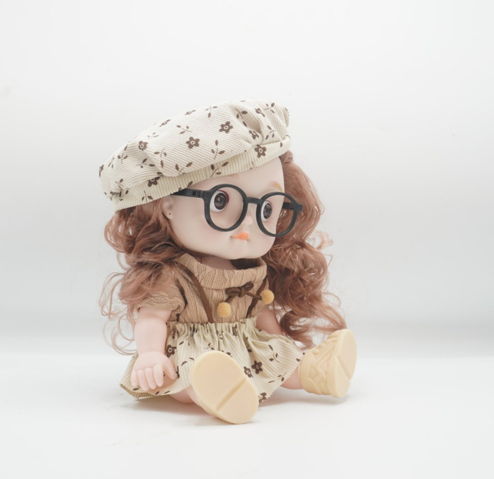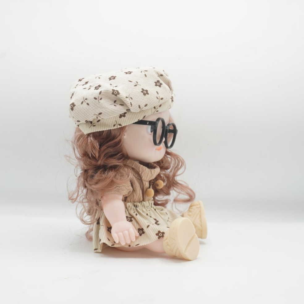 The doll in the image is depicted with brown, wavy hair, wearing a patterned beret, round glasses, a brown top with suspenders, and a floral patterned skirt.