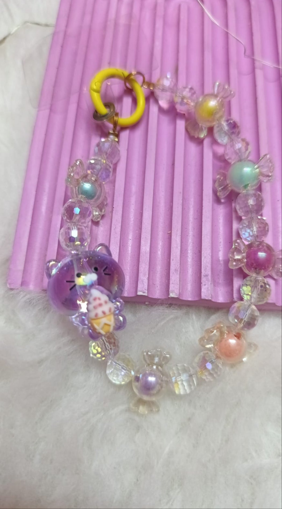 A central kawaii cat charm, identifiable by its large eyes and cute aesthetic, holding an ice cream cone.