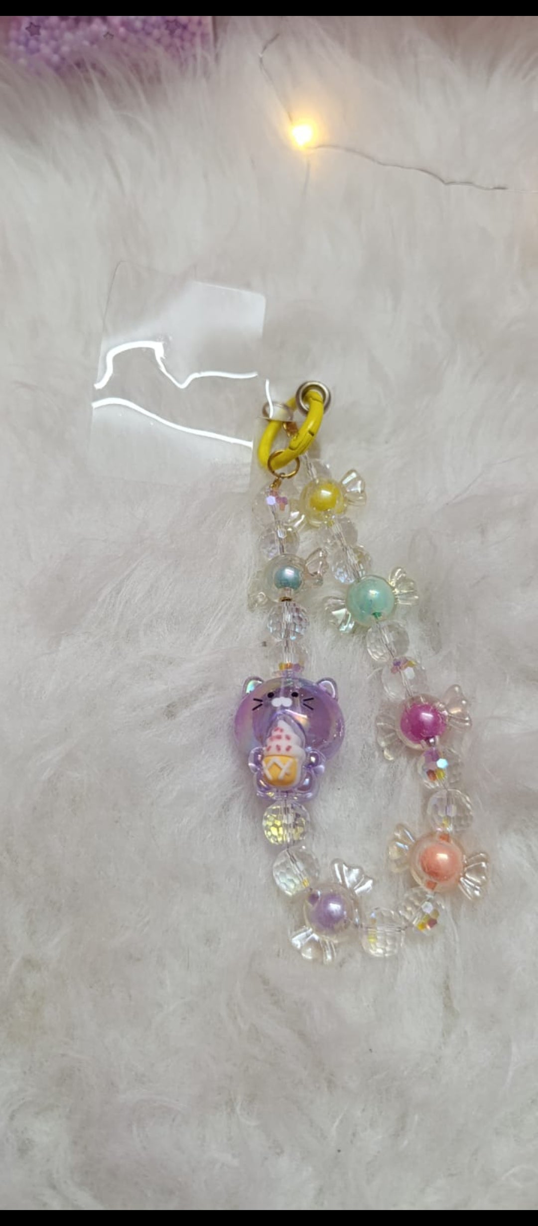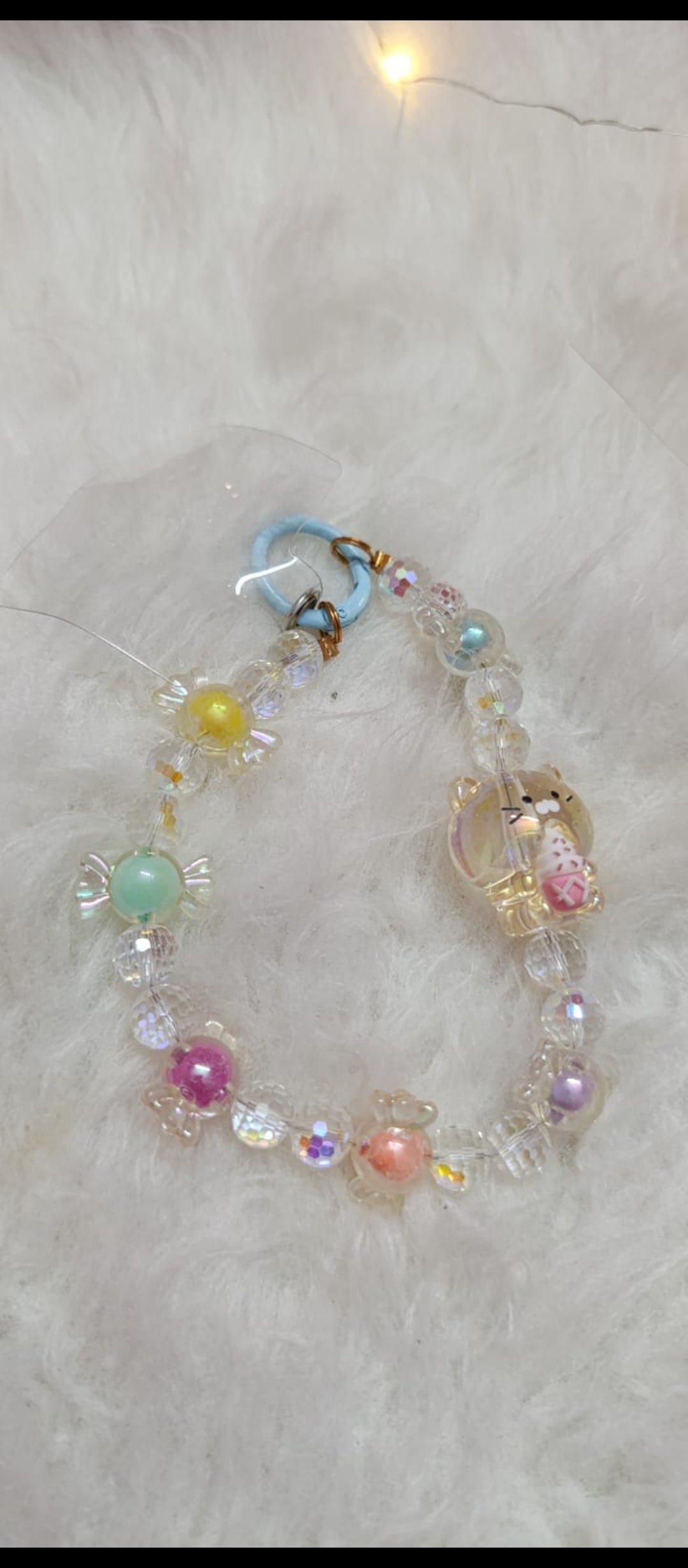 A string of colorful, translucent beads that resemble wrapped candies, giving it a playful and sweet appearance.