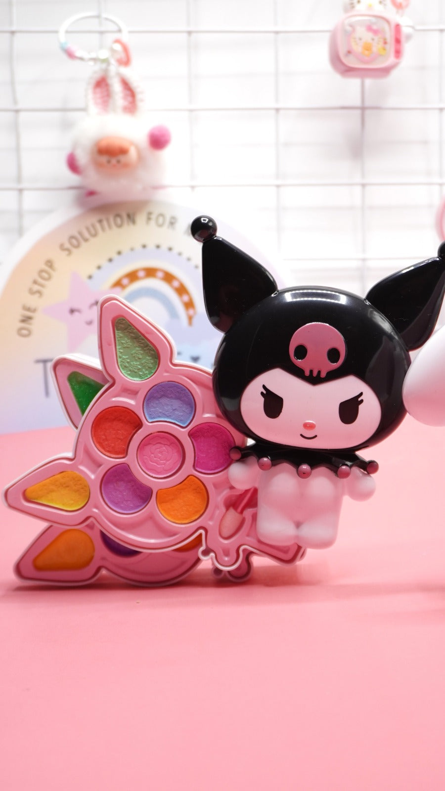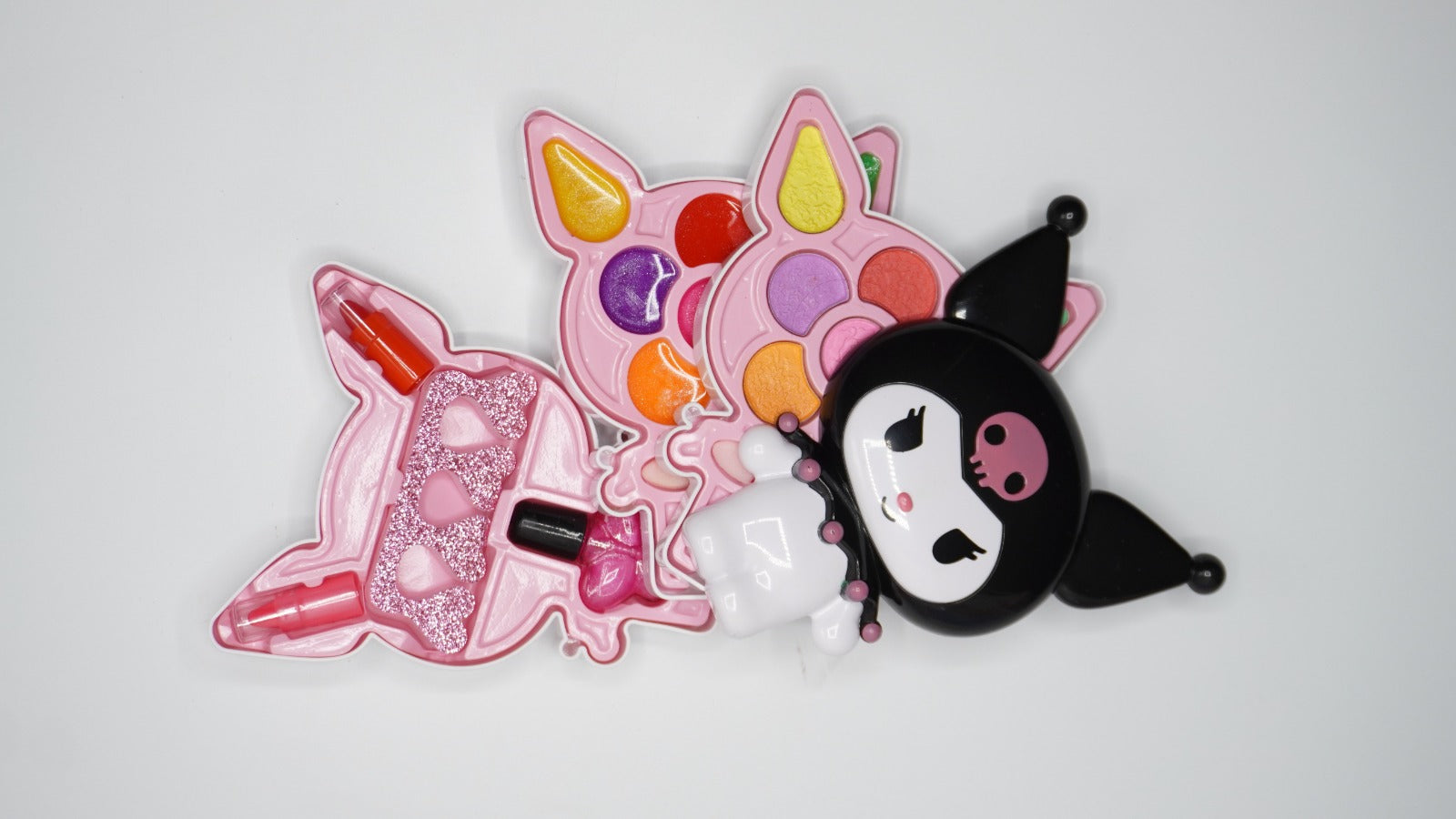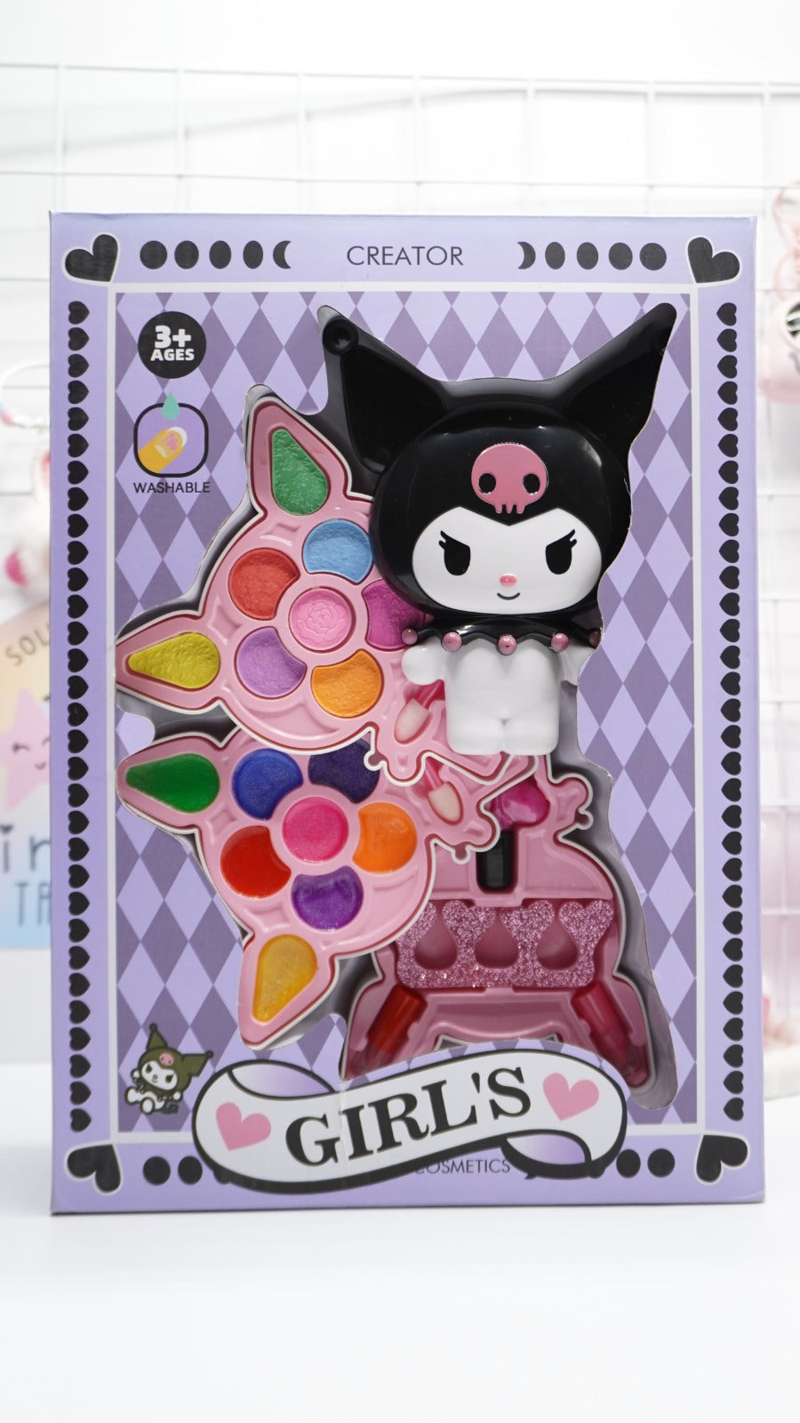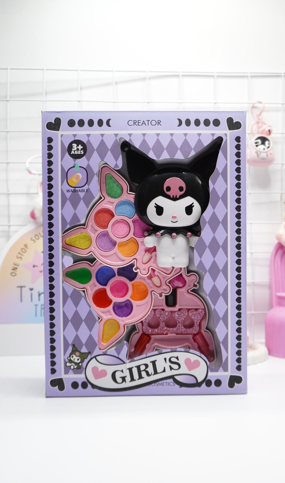 The Kuromi makeup kit is a cute and stylish cosmetic set inspired by the popular Sanrio character, Kuromi. It usually features playful packaging with her signature punk-gothic style—black, pink, and purple accents. The kit often includes essentials like lip gloss, eyeshadow, blush, and brushes, all designed to appeal to fans of kawaii culture. It's perfect for young makeup lovers or collectors who enjoy fun, themed beauty products.
