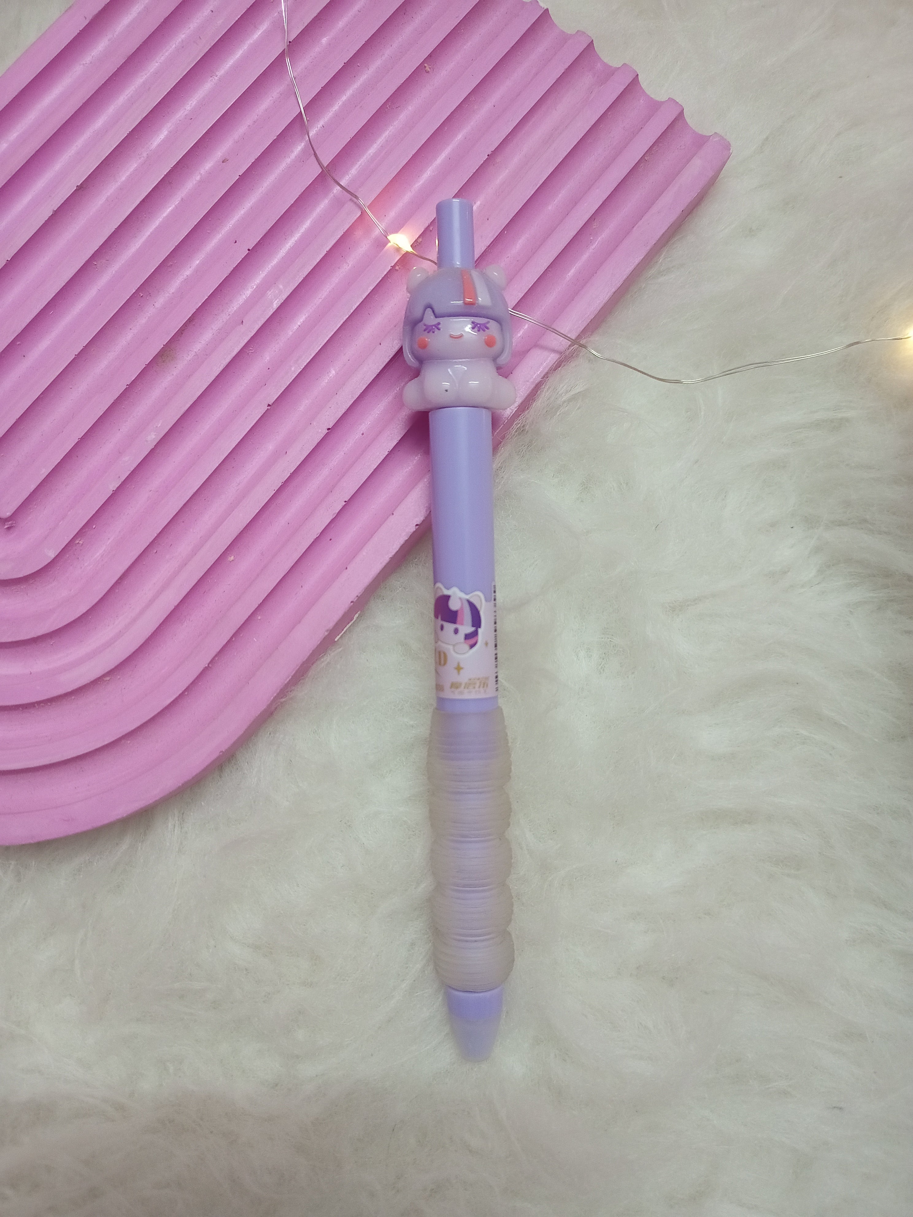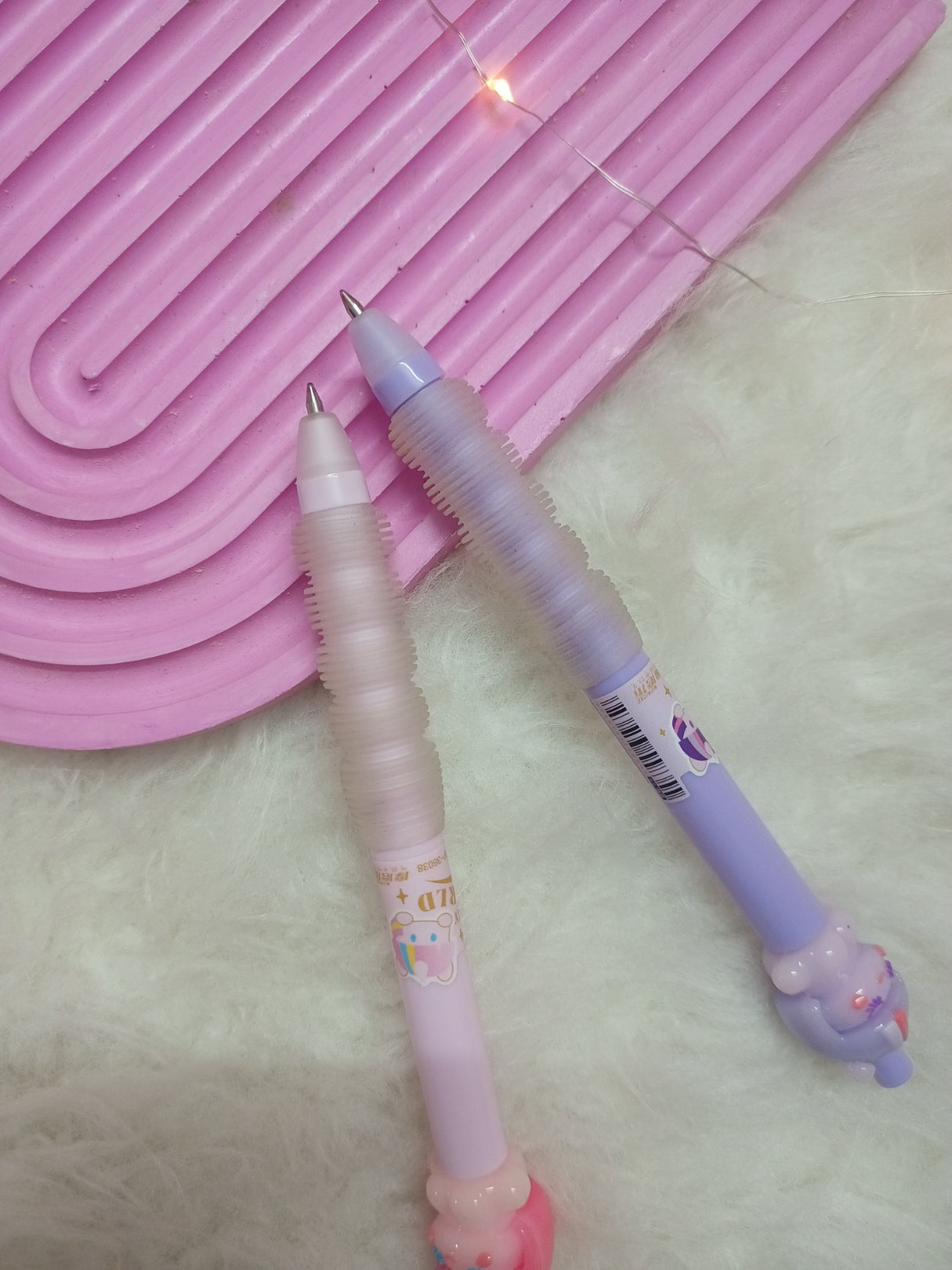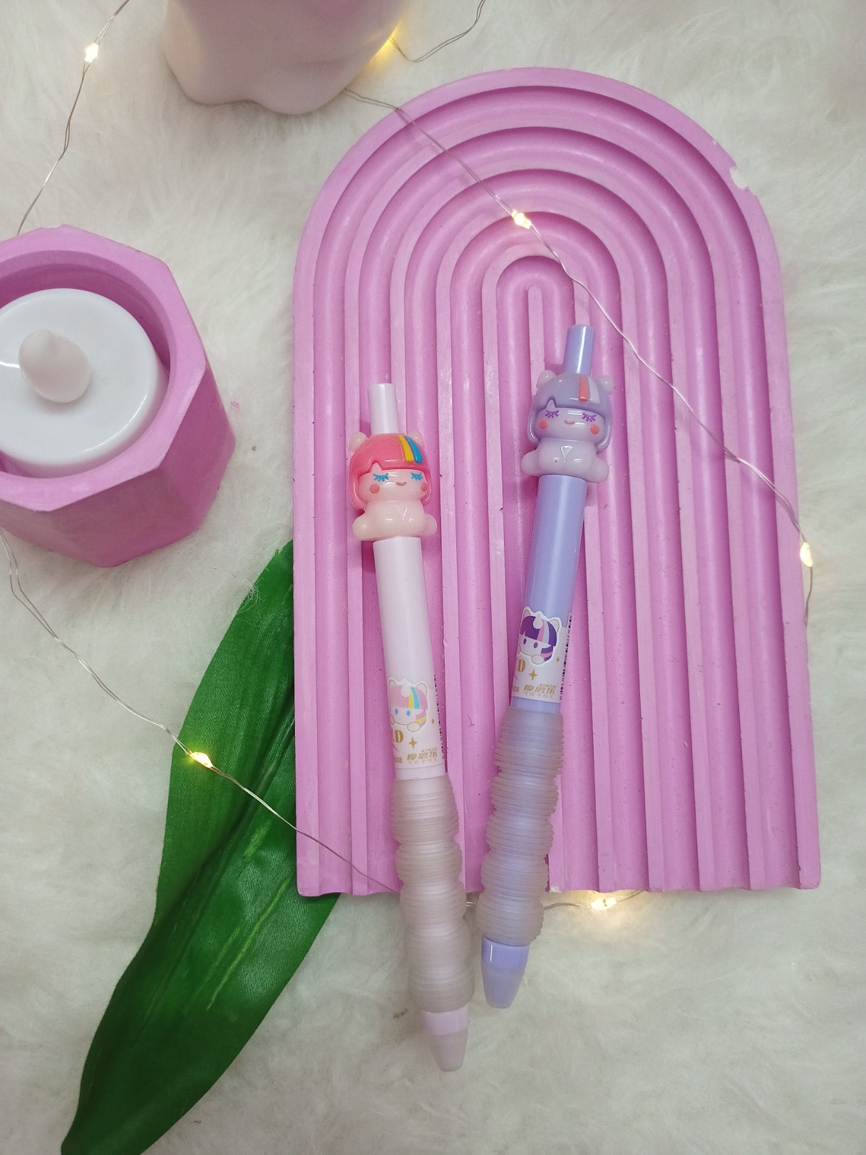 Unicorn Pens: The main focus is on two adorable gel or ballpoint pens, each topped with a different unicorn character. One pen is pink with a unicorn wearing a rainbow hat, while the other is purple with a unicorn character wearing a crown, both adorned with cute details, reflecting a popular "kawaii" aesthetic