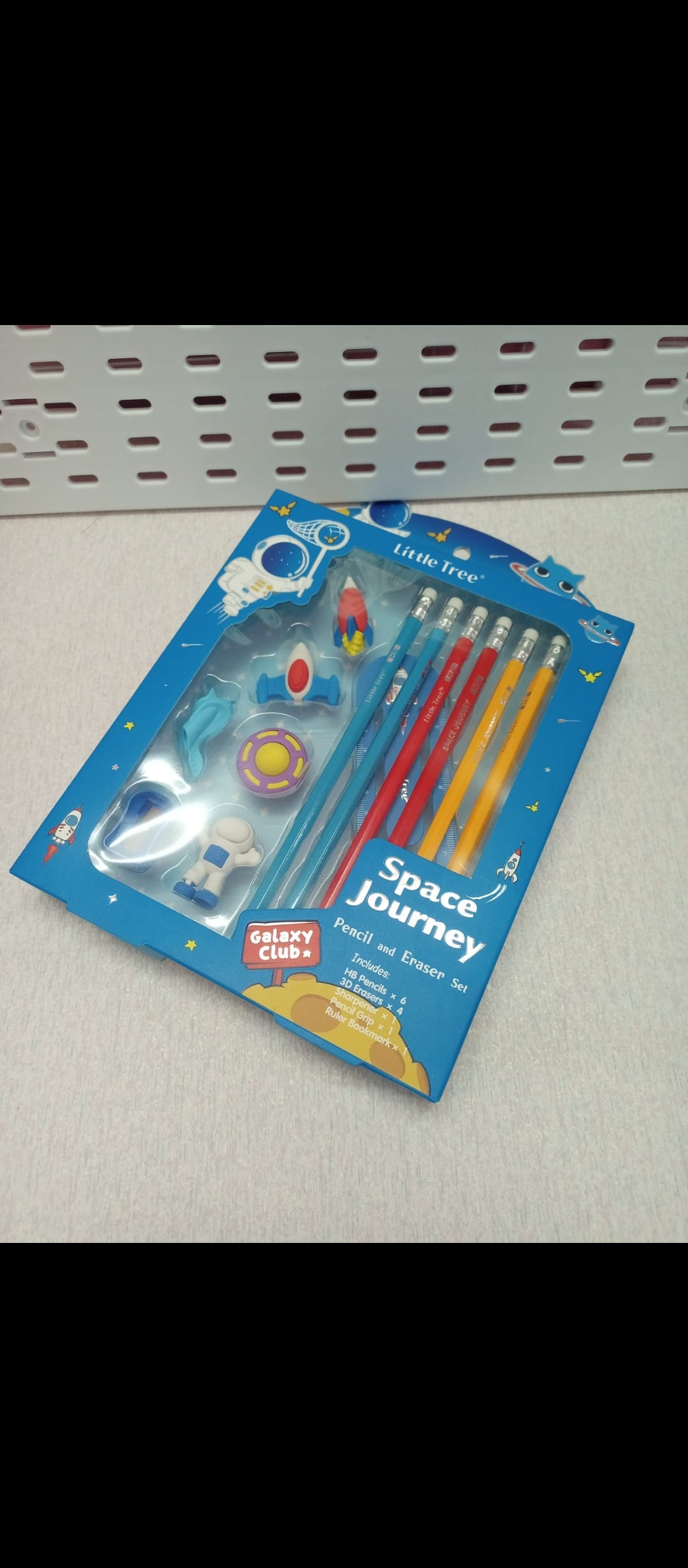 This stationery set is space-themed and includes HB pencils and 3D erasers and scale