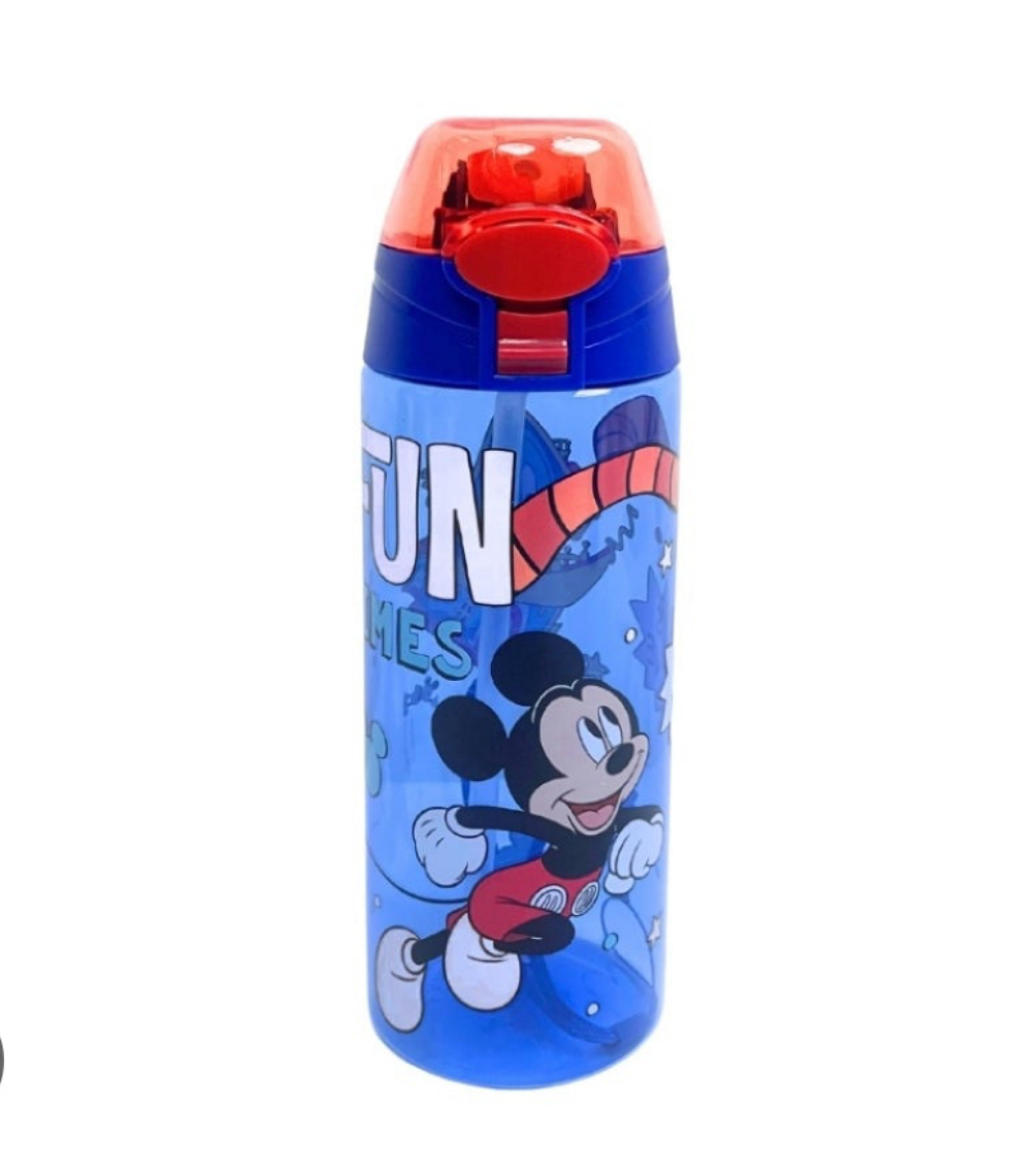 The bottle is blue and transparent, showcasing a graphic of Mickey Mouse in a running or active pose. There are also stars and other design elements, including partially visible text like "S" and "LET MO".