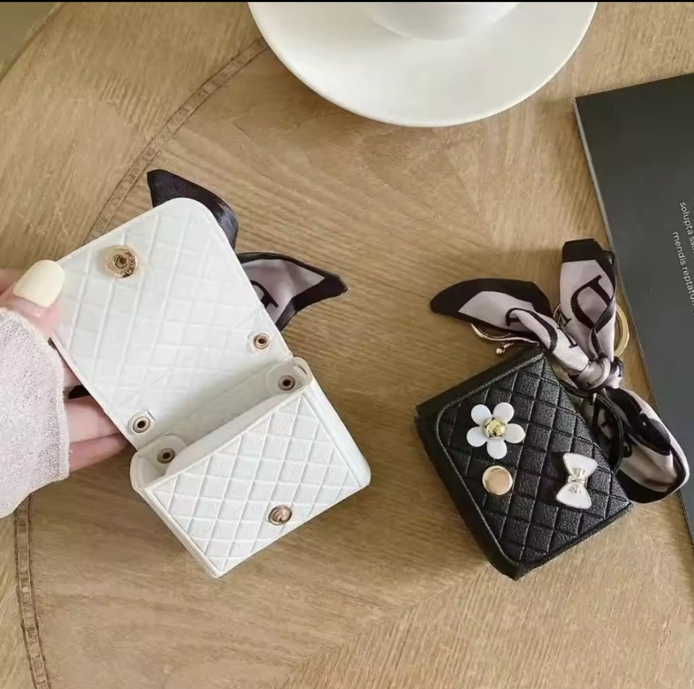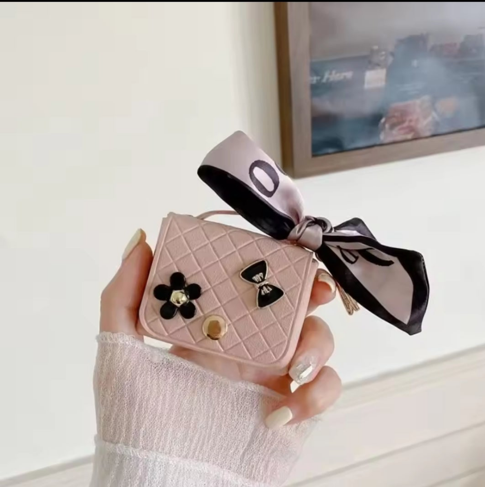 Design: These keychains are designed as small, quilted-style purses or pouches, reminiscent of designer handbags. They feature a flap closure and are adorned with a bow and a floral embellishment on the front.