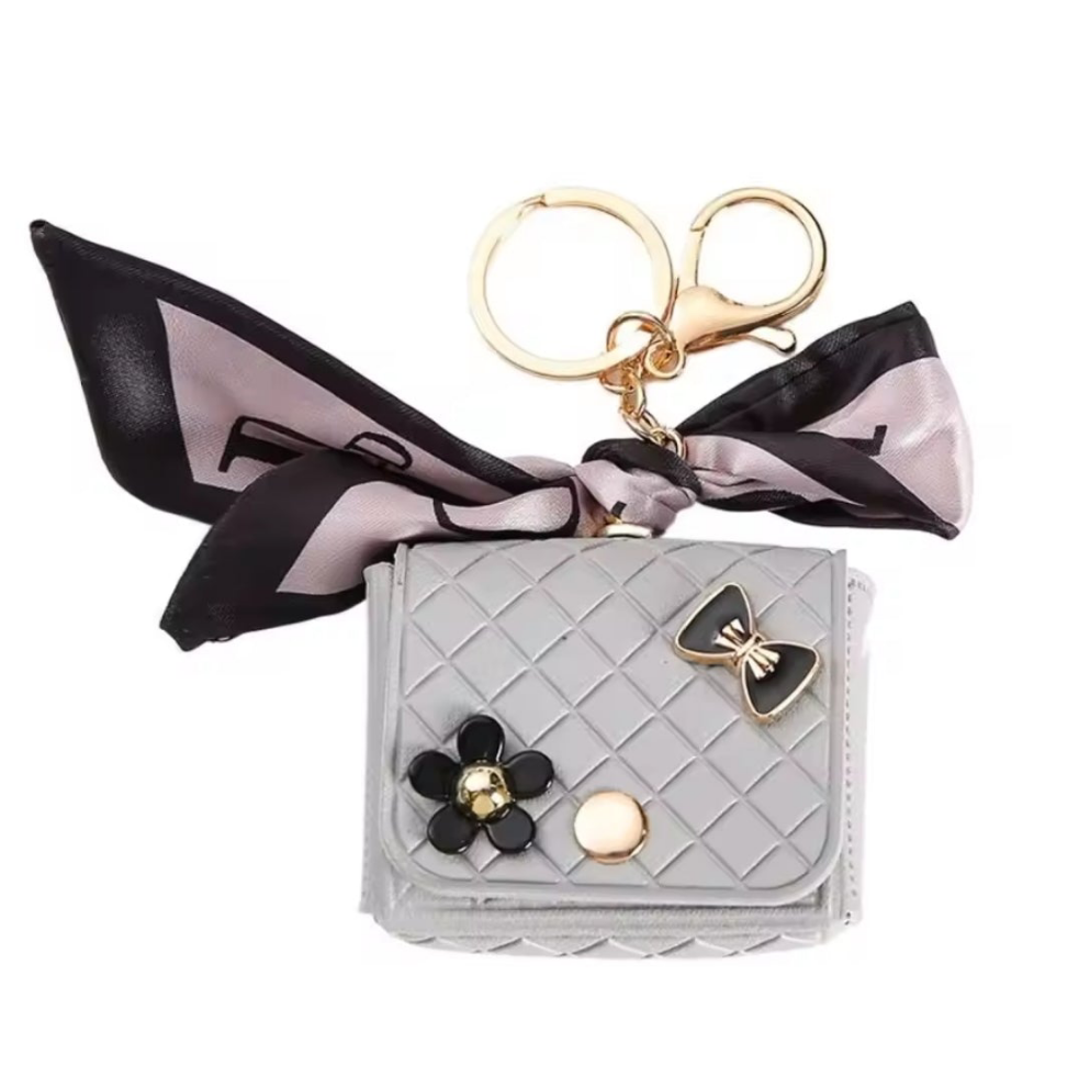 Attached Scarf: Each keychain has a small, patterned silk scarf tied around the metal ring, adding a stylish and elegant touch. The scarf patterns vary slightly between the different colored keychains.
