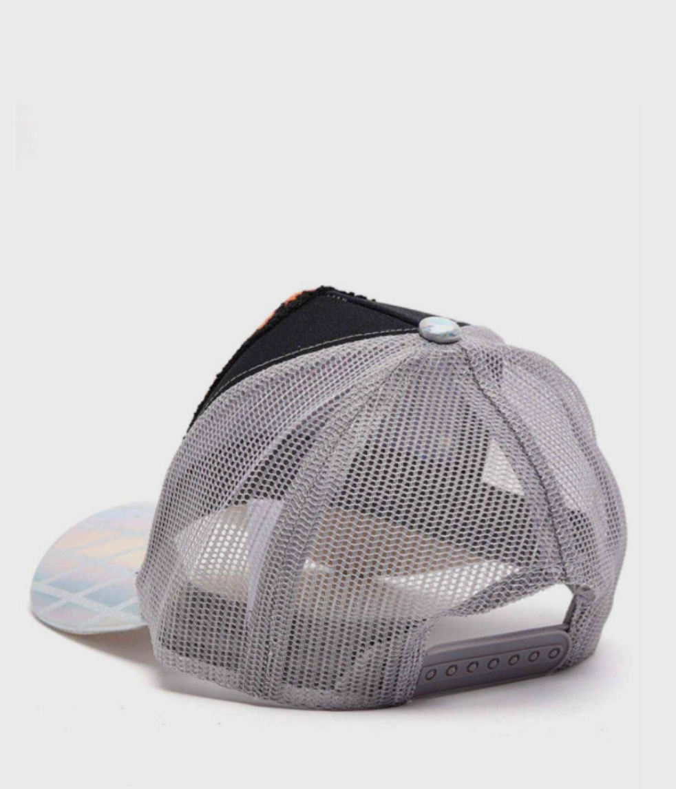 Color Scheme: The main body of the cap is black, with white mesh on the back and a white, iridescent visor.