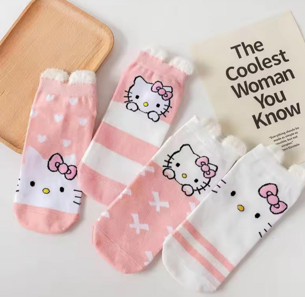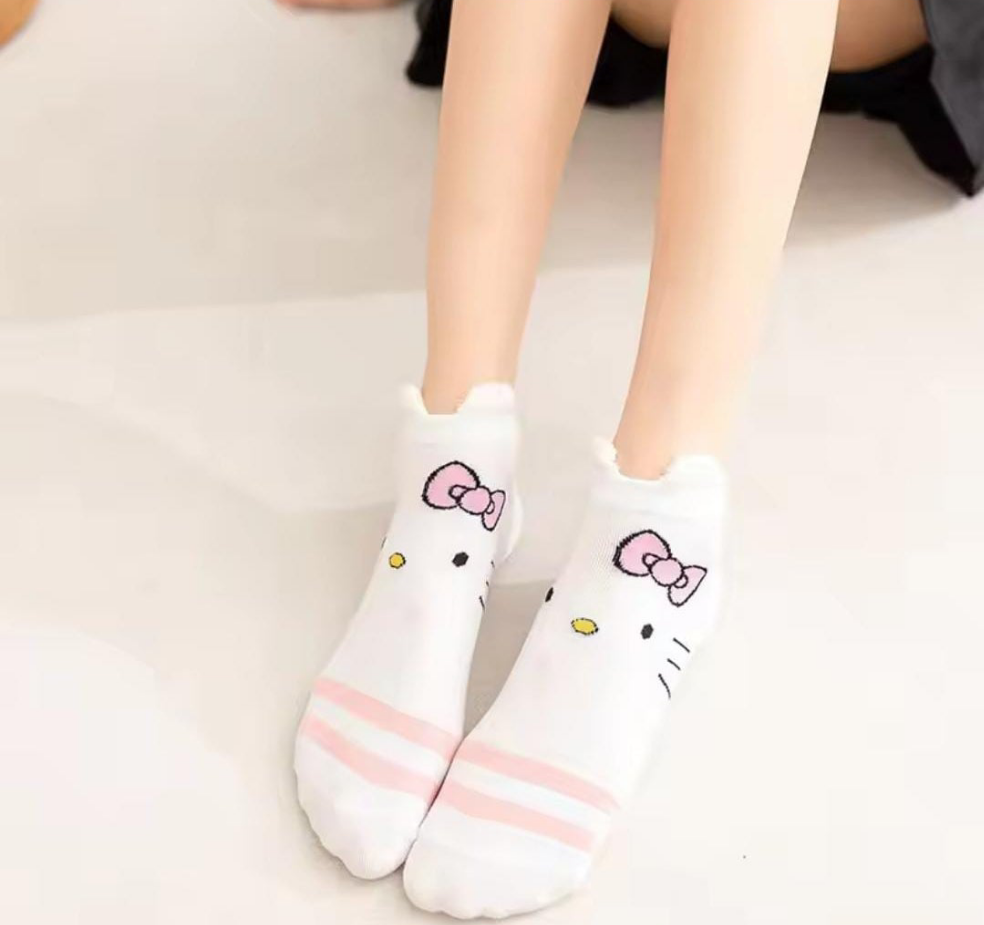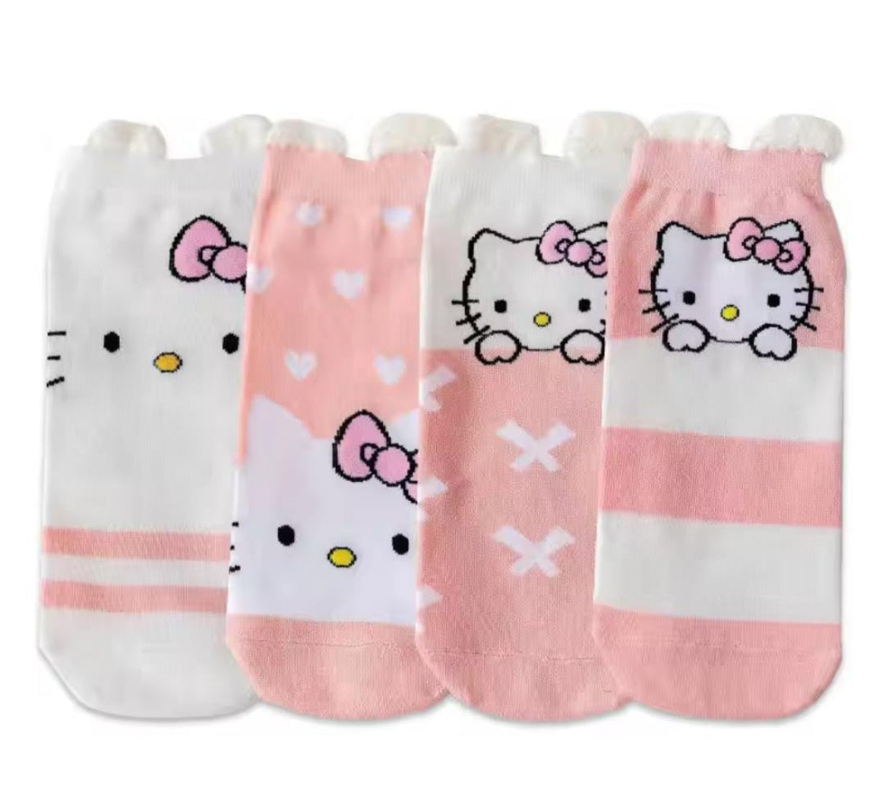 Designs:Each pair features a distinct Hello Kitty design, including Hello Kitty's face with bows, as well as patterns like pink and white stripes and small pink crosses on a white background.