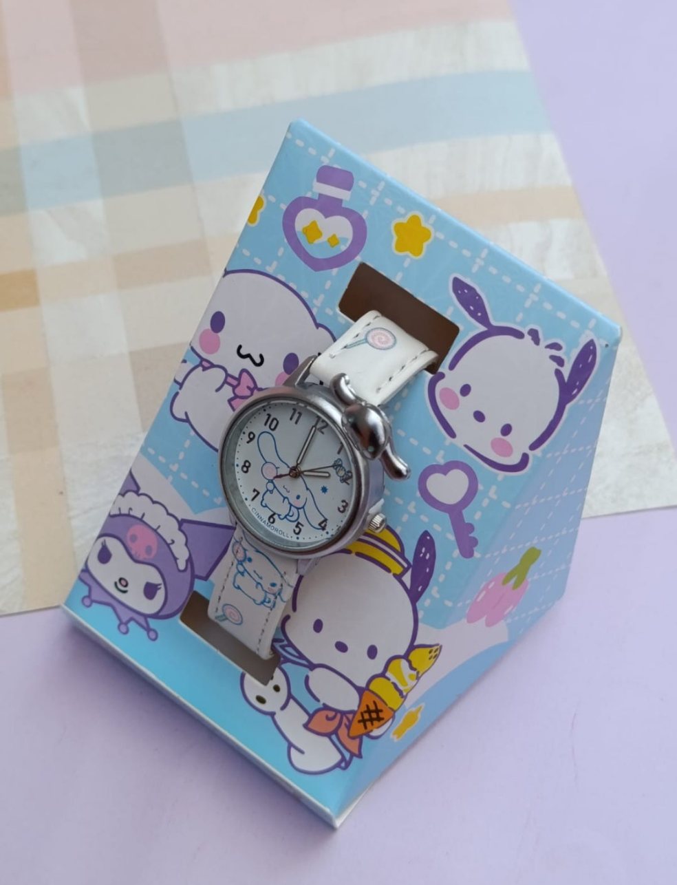 These watches have a round dial with a sanrio character design and appear to have a luminous display for visibility in low light conditions. They are described as student watches, suitable for daily wear with a focus on a cute and whimsical style.
