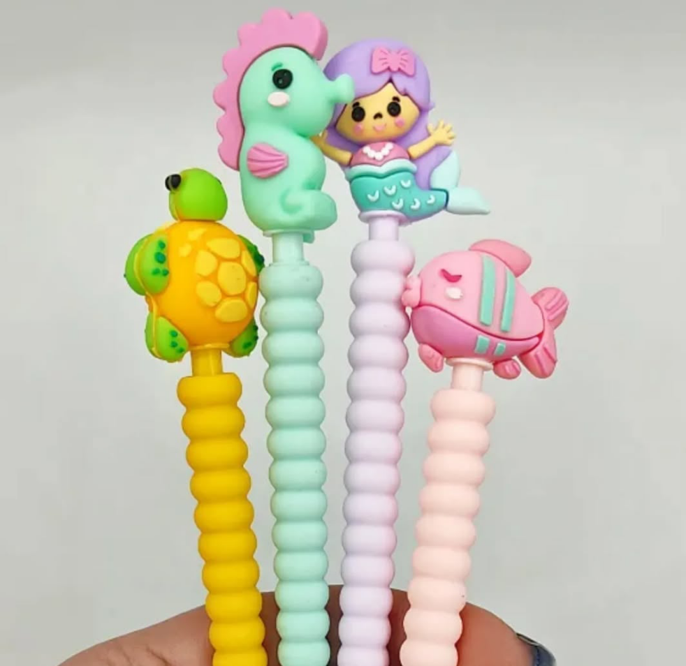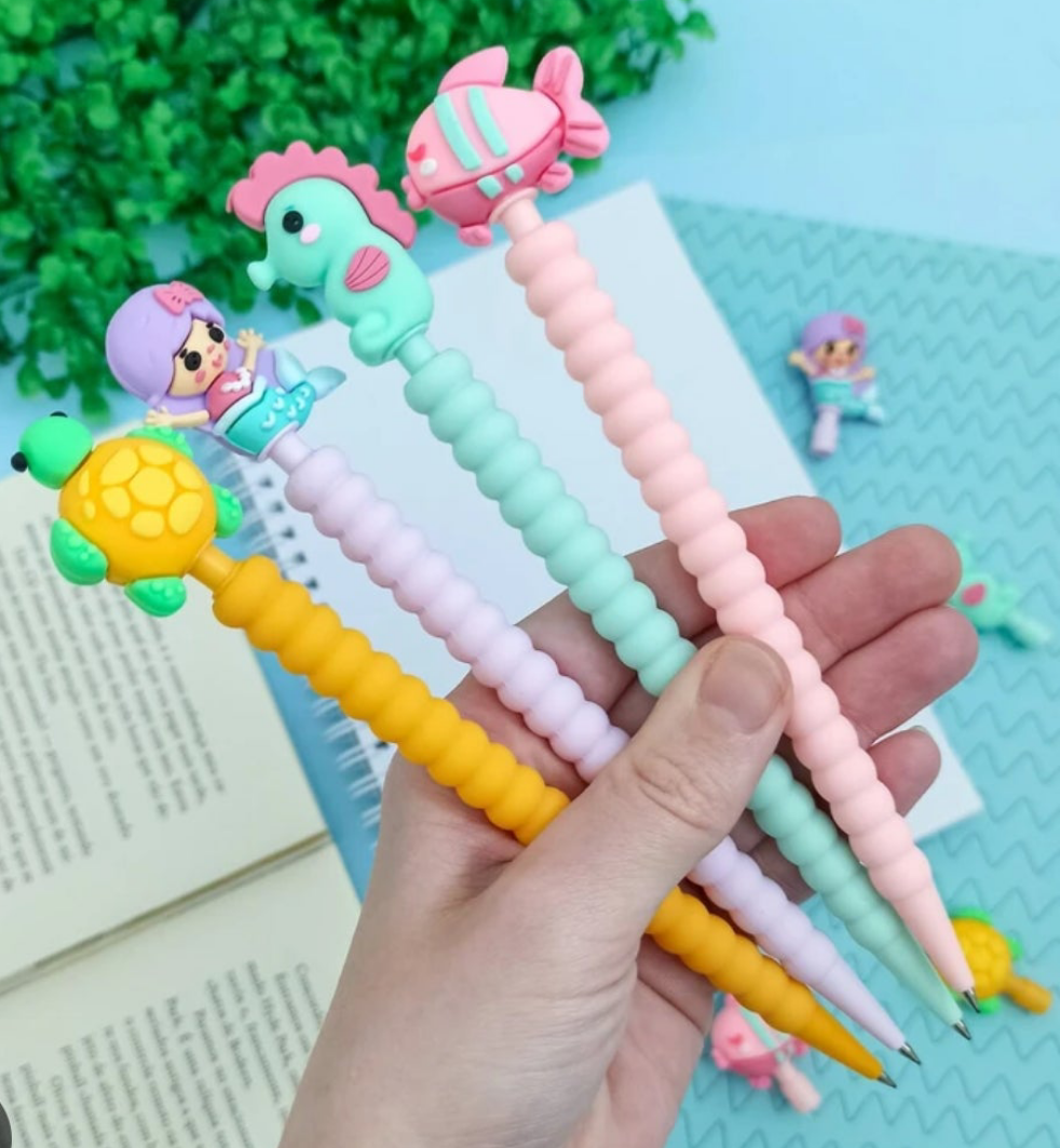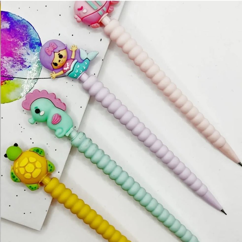 Toppers: Each pencil is adorned with a different sea-themed character at its top, including a mermaid, a seahorse, a turtle, and potentially a fish or similar aquatic creature.