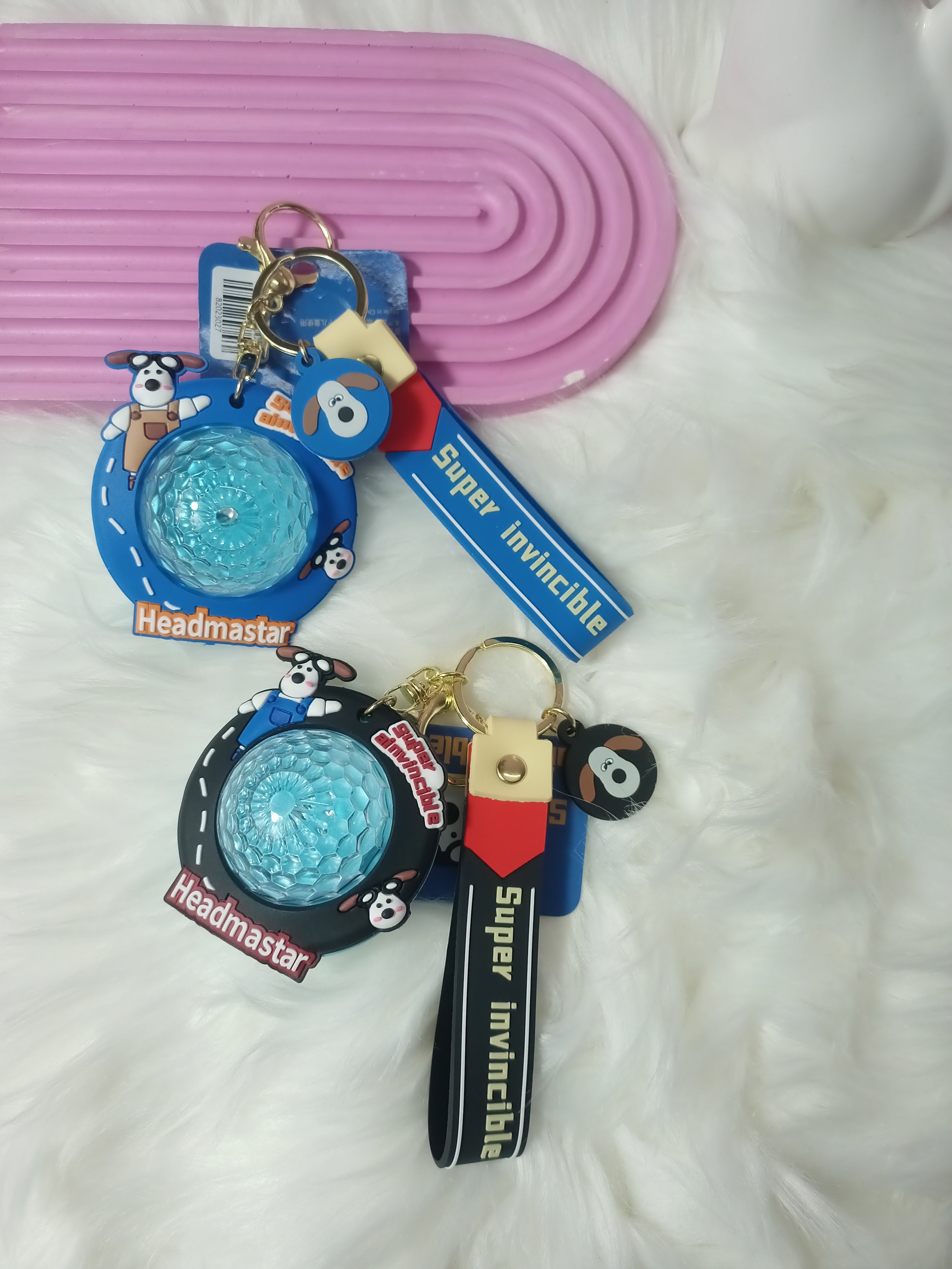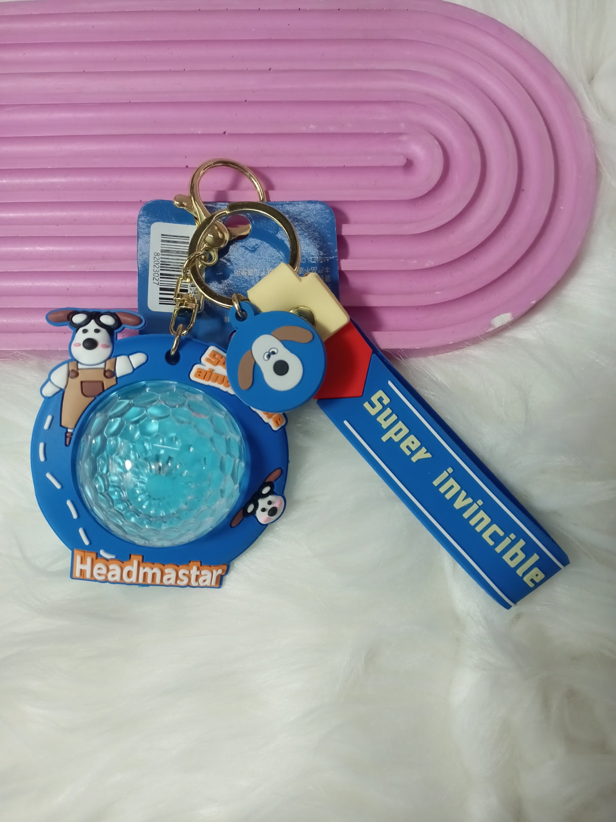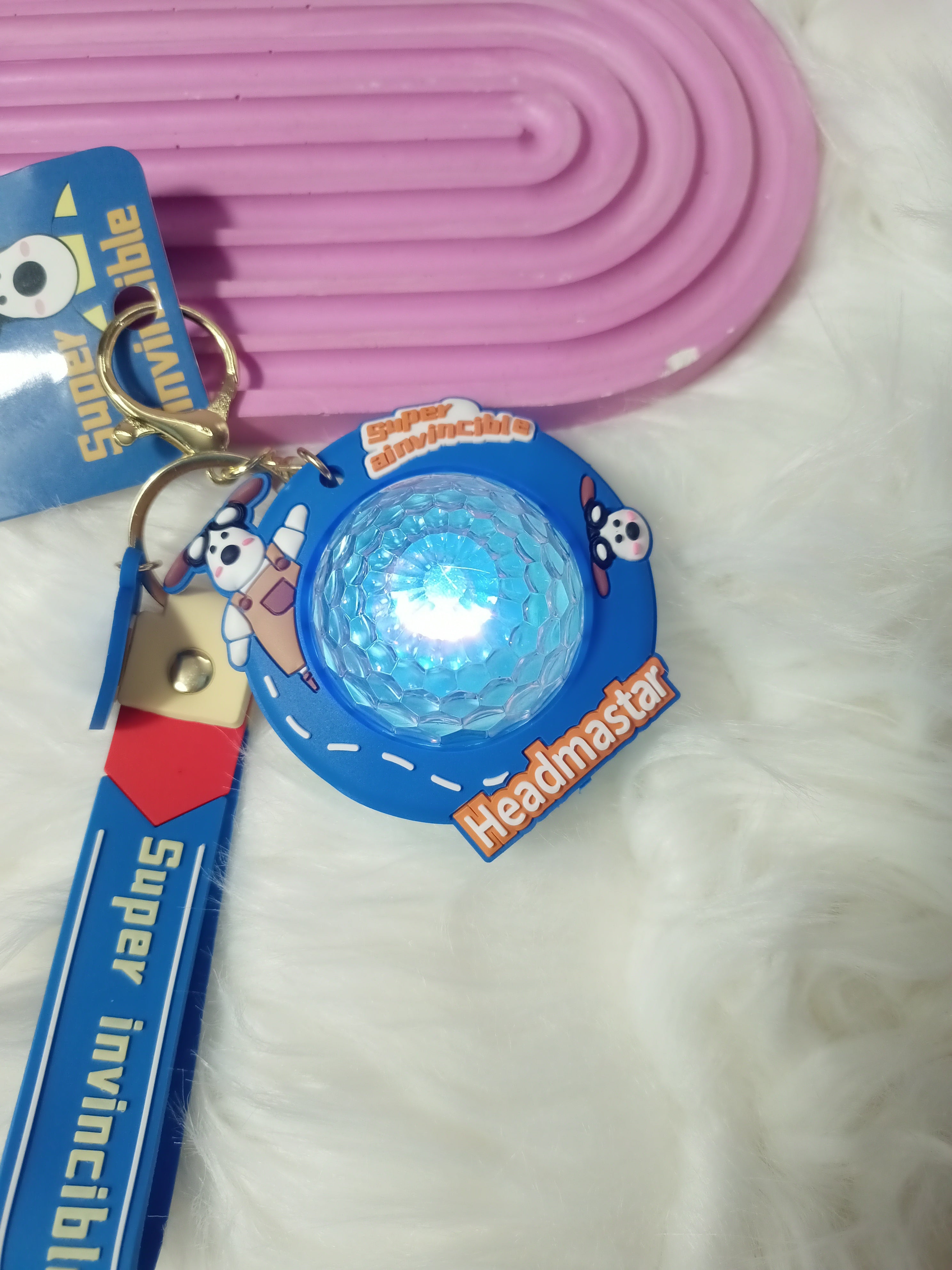 Add a playful and unique touch to your keys or bag with this "Super Invincible Headmastar" keychain. The design features a cartoon dog character on a round tag, paired with a transparent blue ball. The text "Super Invincible Headmastar" is printed on a durable strap attached to the keychain. The interactive design of the blue ball makes it an engaging and fun accessory. Crafted from resilient materials, this keychain is a great gift for cartoon lovers and anyone who wants to personalize their belongings with a cute and distinctive accessory.