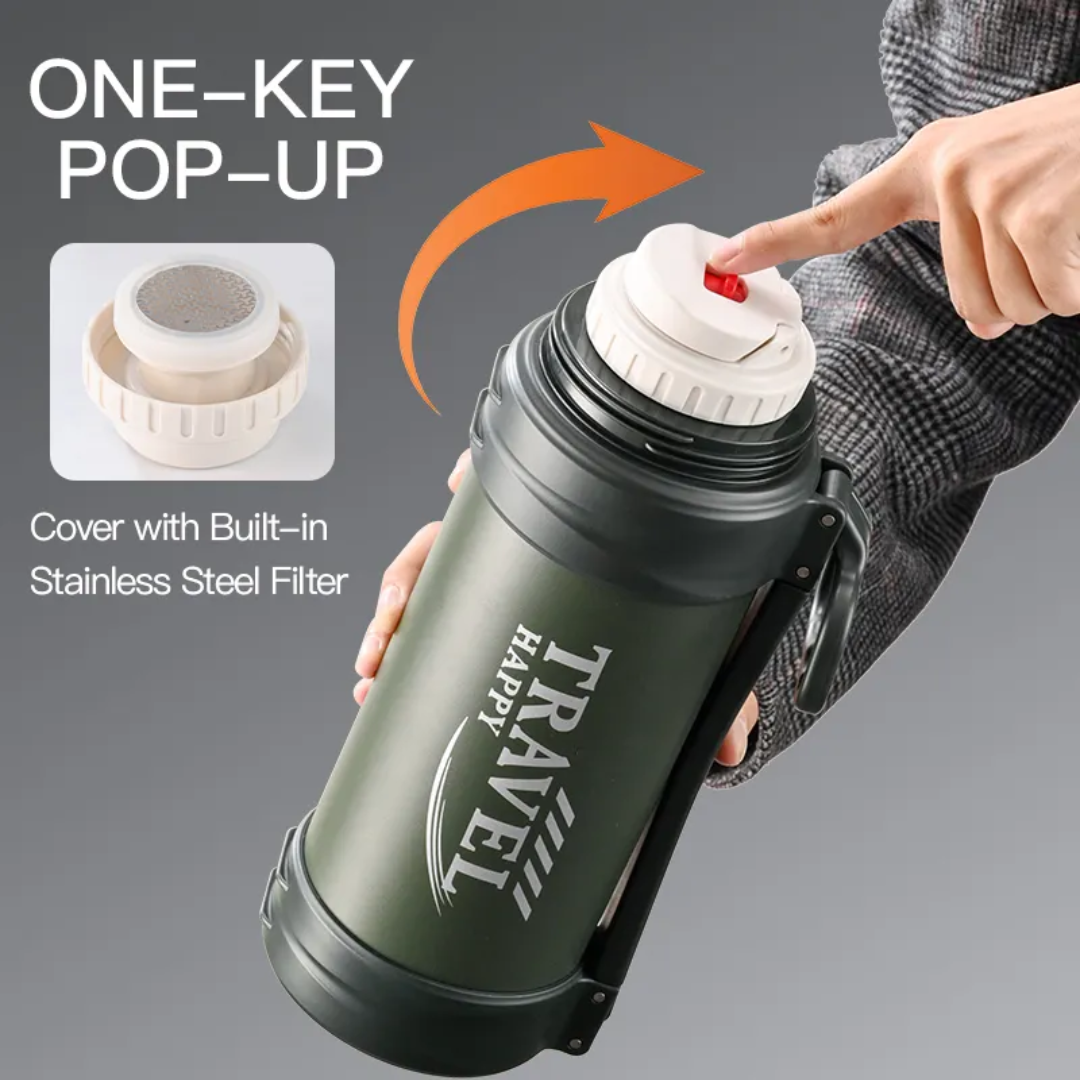 Stay hydrated wherever you go with the TRAVEL HAPPY 3-in-1 Stainless Steel Vacuum Flask — the perfect companion for travel, camping, office, or gym use. Designed for convenience, durability, and style, this flask combines innovation with practicality to meet all your beverage needs.
