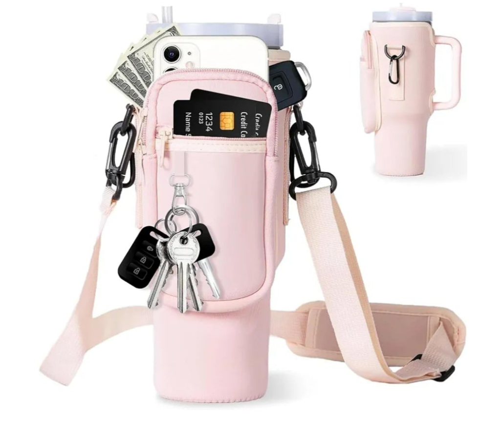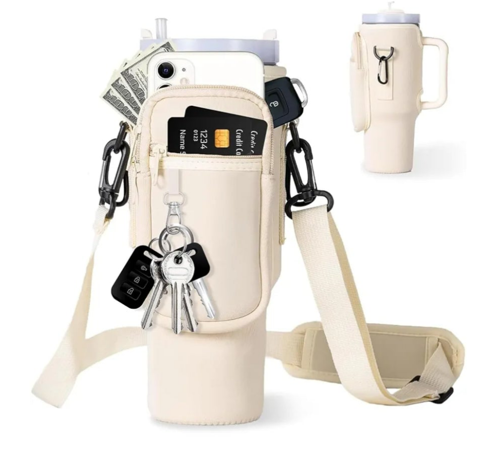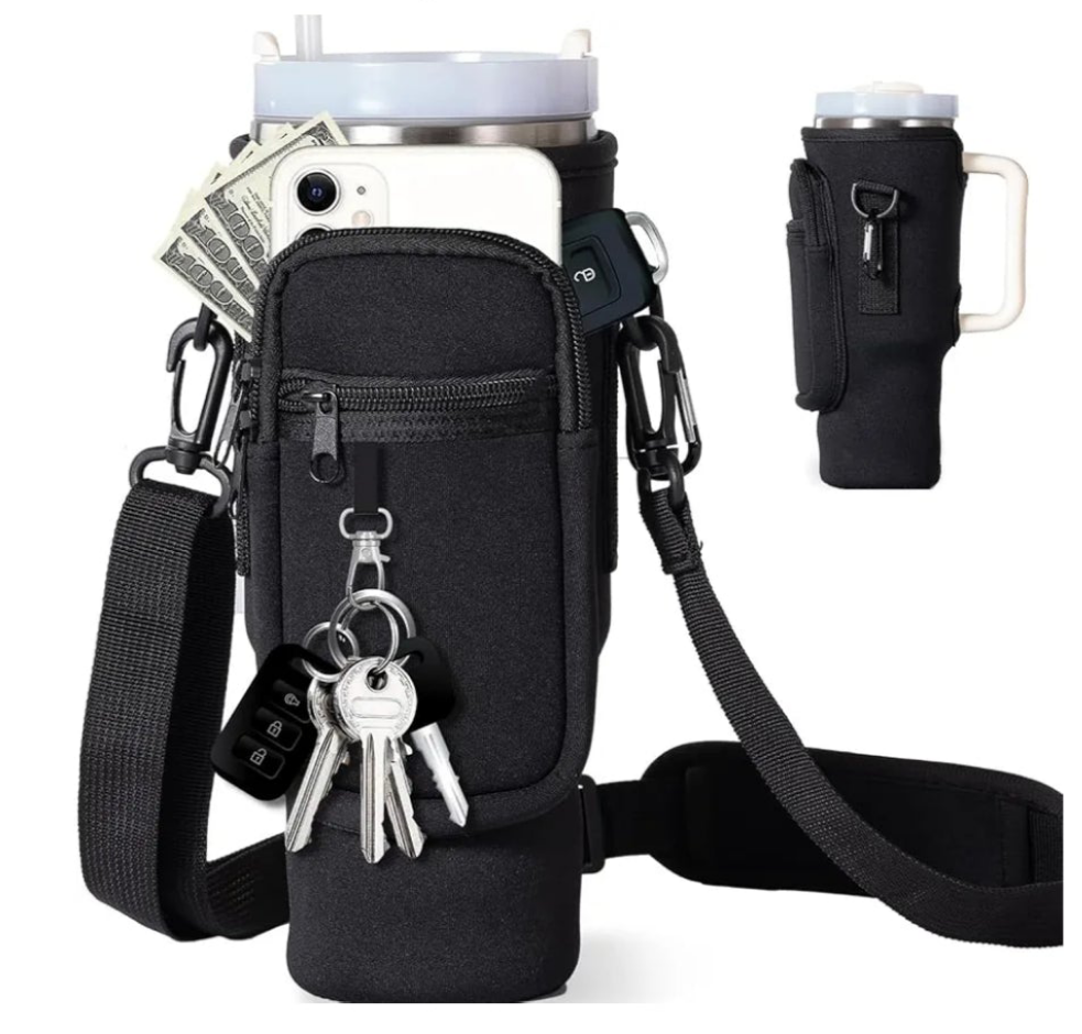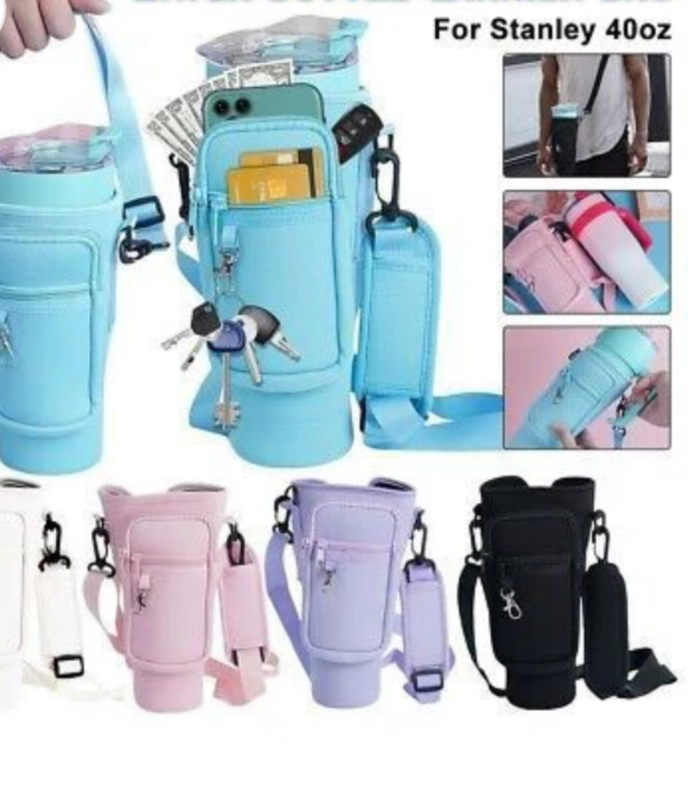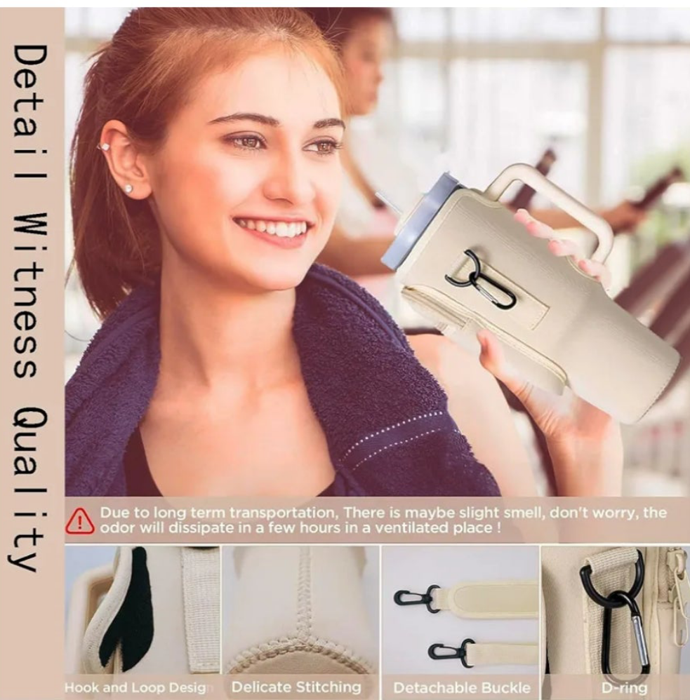 【Specially Designed for Stanley 40oz Tumbler】Water bottle carrier with strap is perfectly matched for Stanley Quencher H2.0 40oz, for Stanley Adventure Quencher 40oz, and Simple Modern 40oz Tumbler. The cups fit snugly, so even when wearing the water bottle carrier bag, the tumbler fits easily in the car cup holder. No more struggles with ill-fitting carriers. It's not just a Stanley cup accessories–it's a statement piece that seamlessly blends style and practicality.