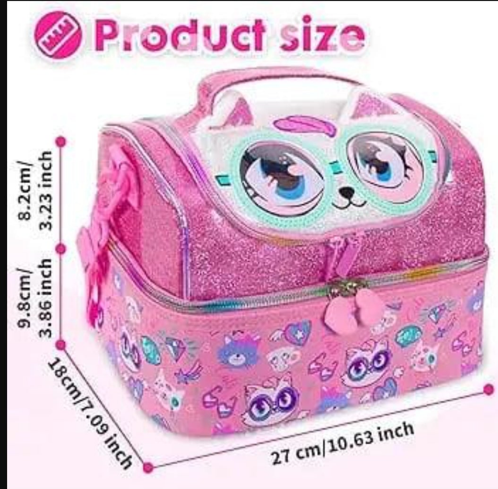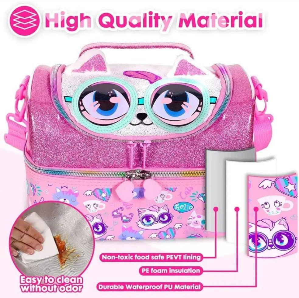 A double-decker lunch bag designed to keep food fresh and organized and made from durable, non-toxic PU material with a food-safe PEVT lining, and PE foam insulation. The insulated compartments keep food cold for over 9 hours, and the dual-layer design allows for the separation of hot and cold items. It has an adjustable strap for easy carrying and is suitable for kids aged 3 and up.